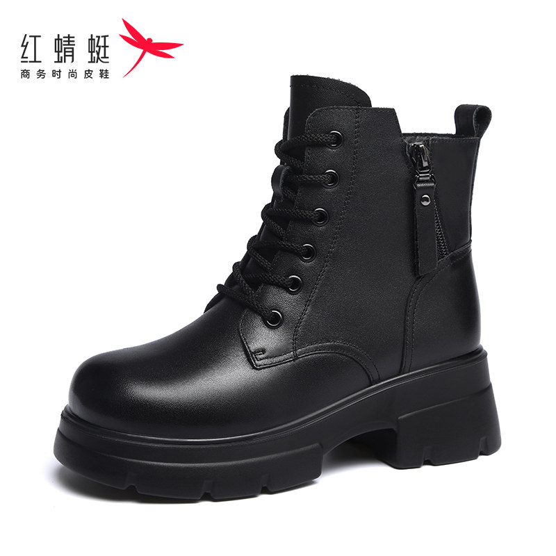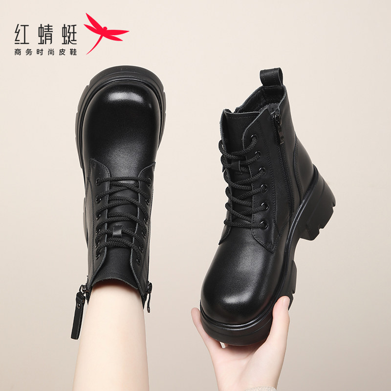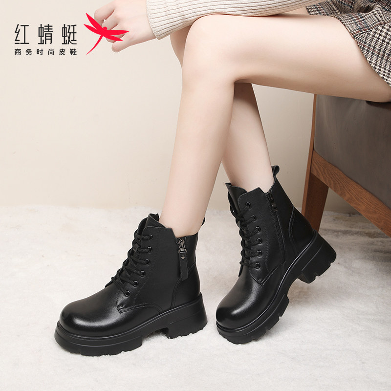 红蜻蜓靴子英伦厚底马丁靴女款新款秋冬季加绒保暖小短靴真皮女靴