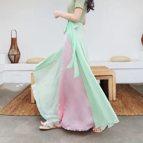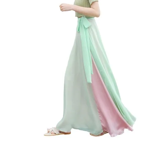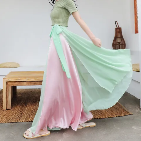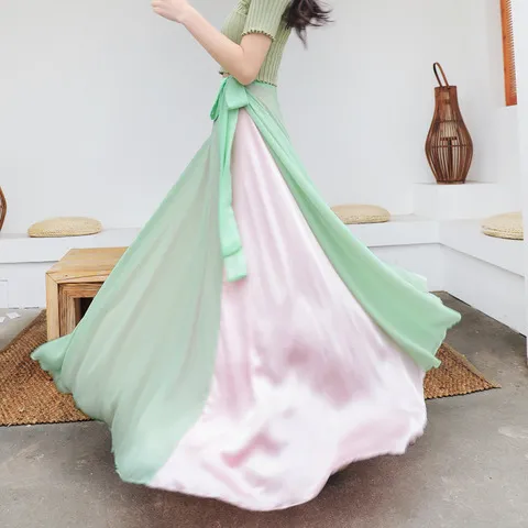 长裙现代绑带围裙一片式宫廷女修身飘逸大摆半身双色缎面雪纺舞蹈