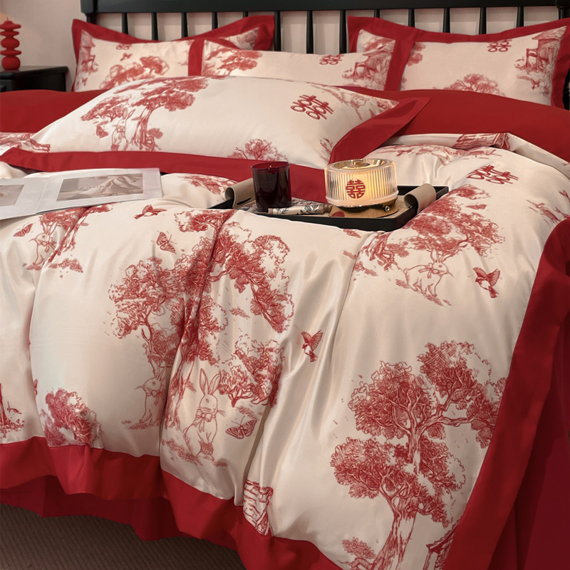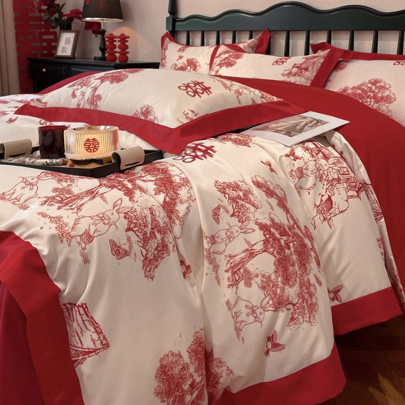 高档中式婚庆床上四件套红色纯棉数码印花被套床单新婚高级感床品