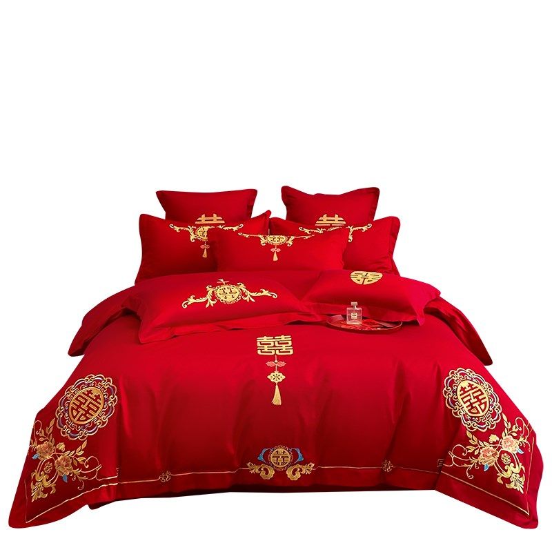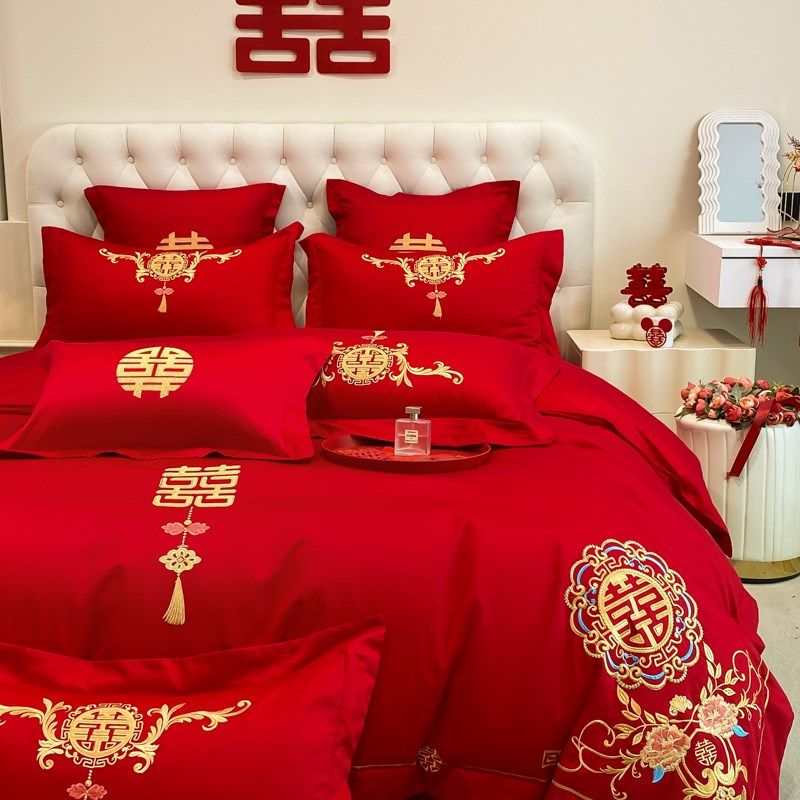高档婚庆160支长绒棉四件套纯z棉大红色床单刺绣结婚床上用品陪嫁