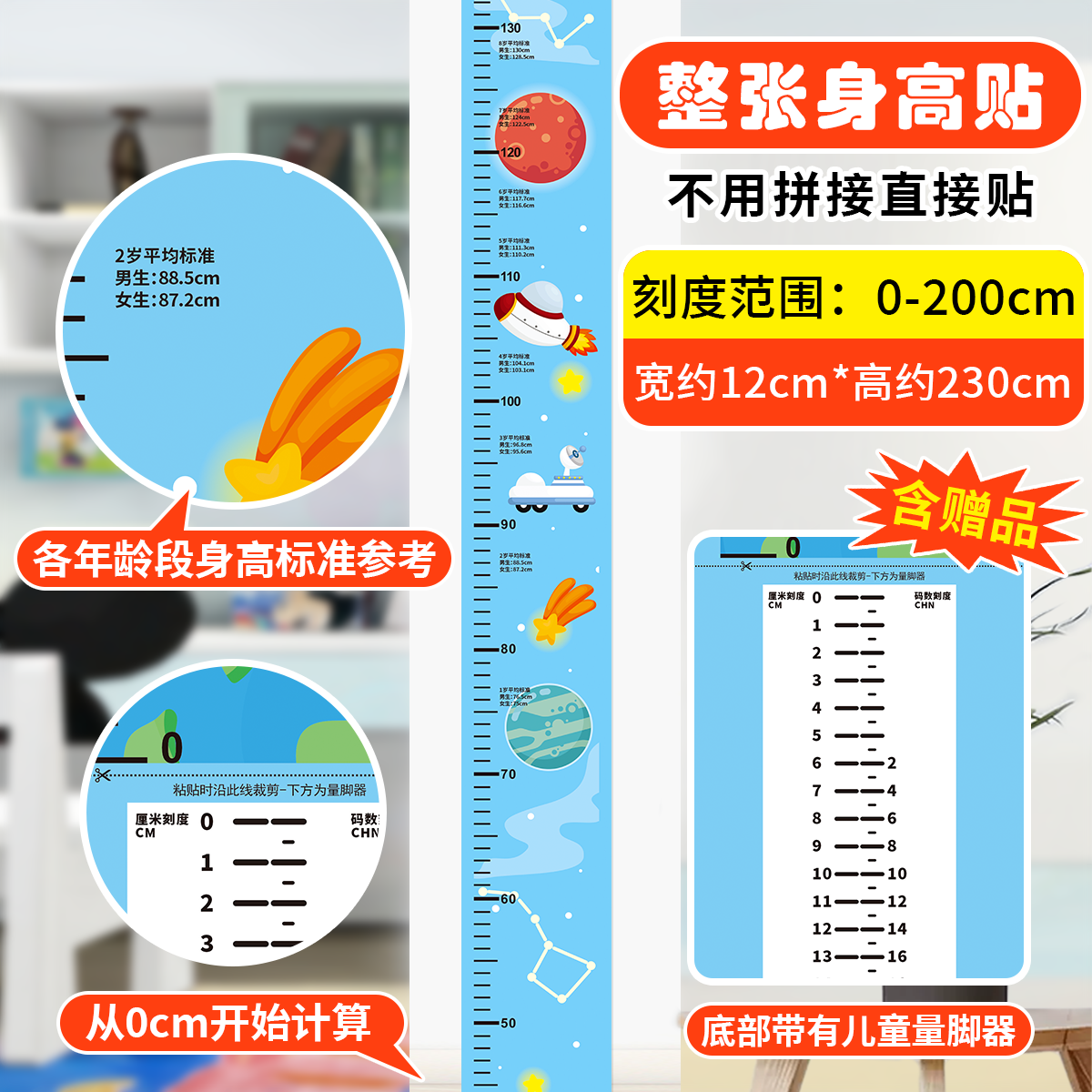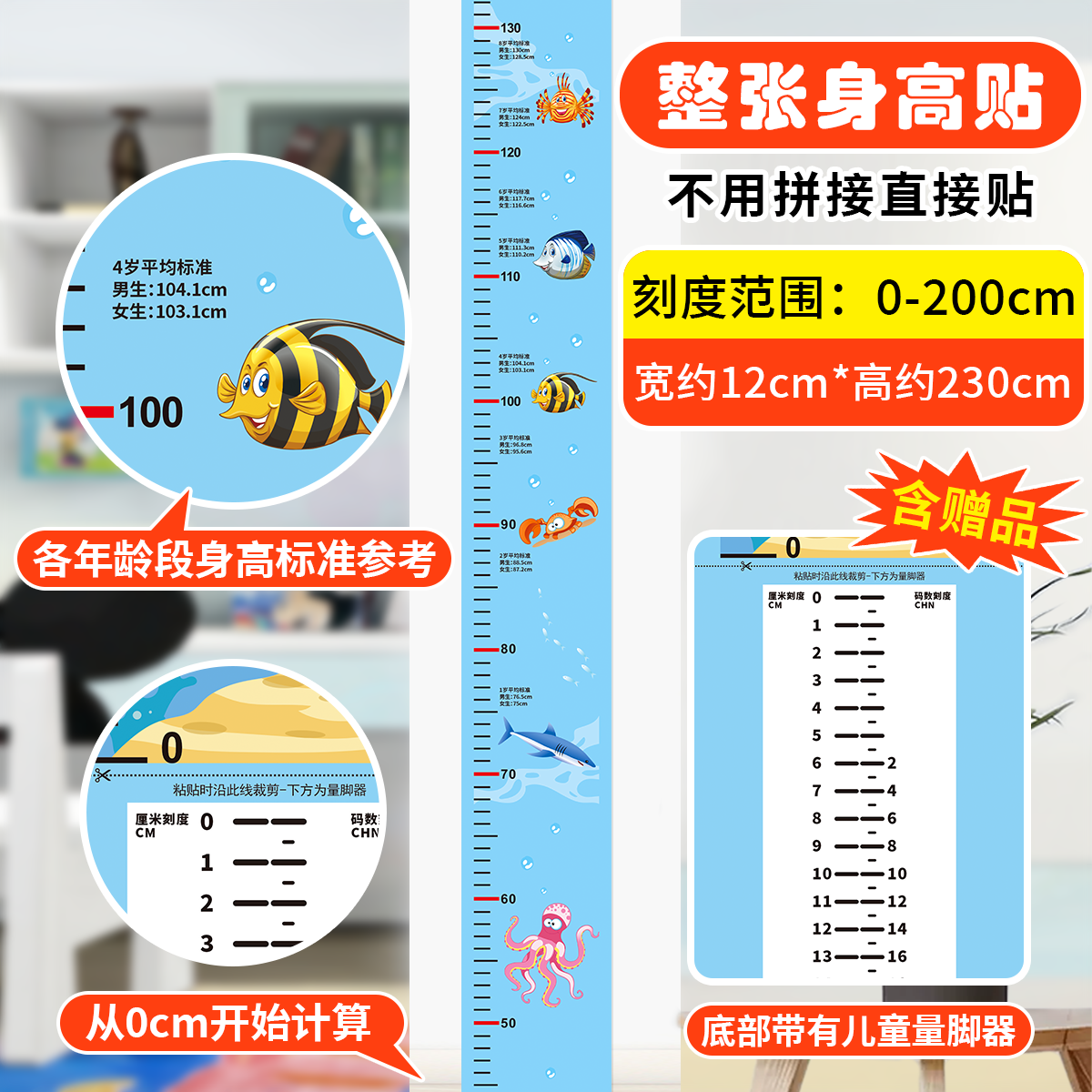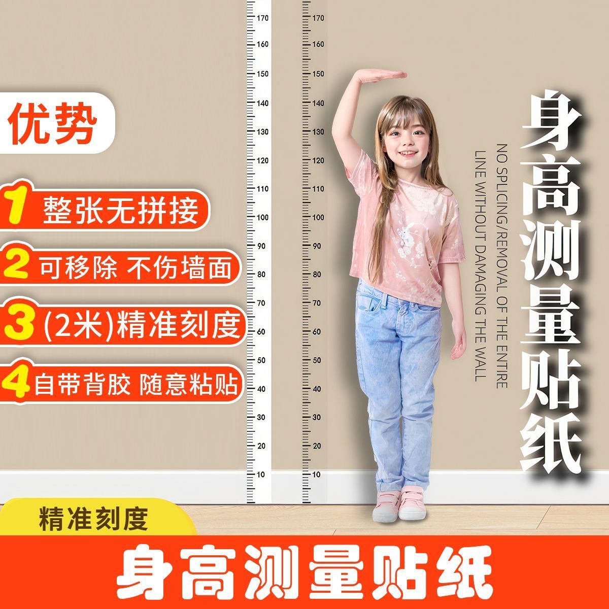 2米整张儿童透明身高墙贴纸可移除不伤墙尺子测量仪环保安全