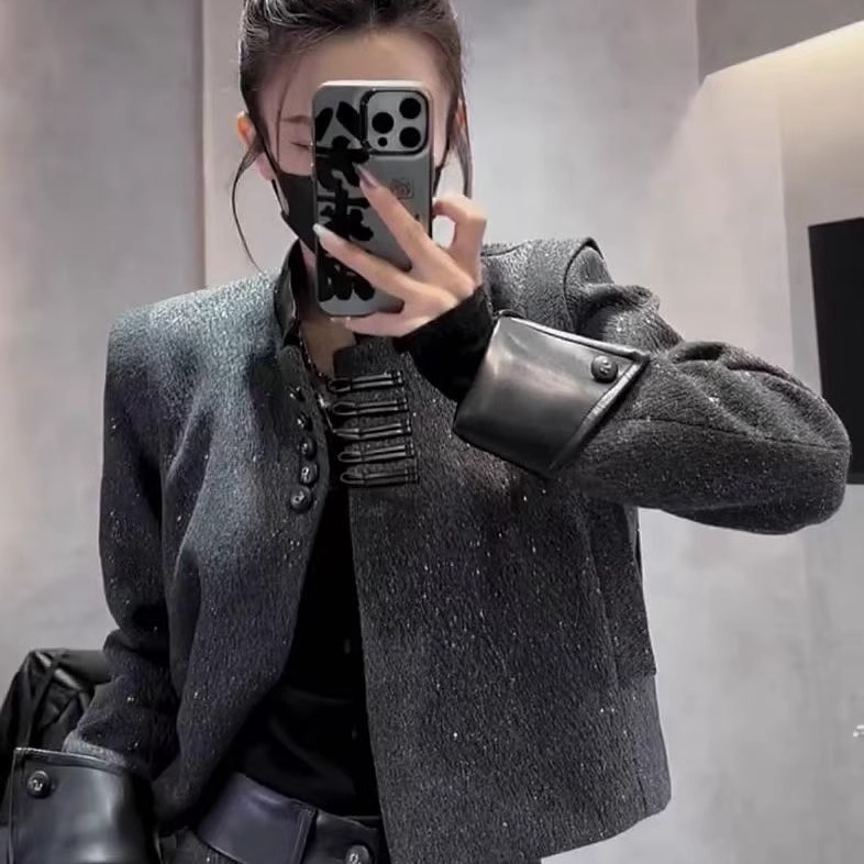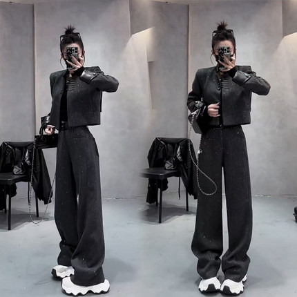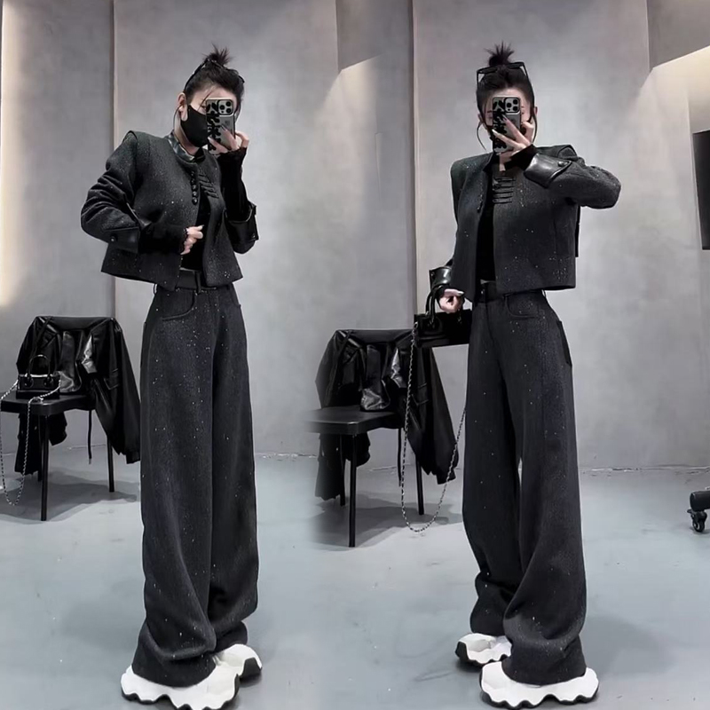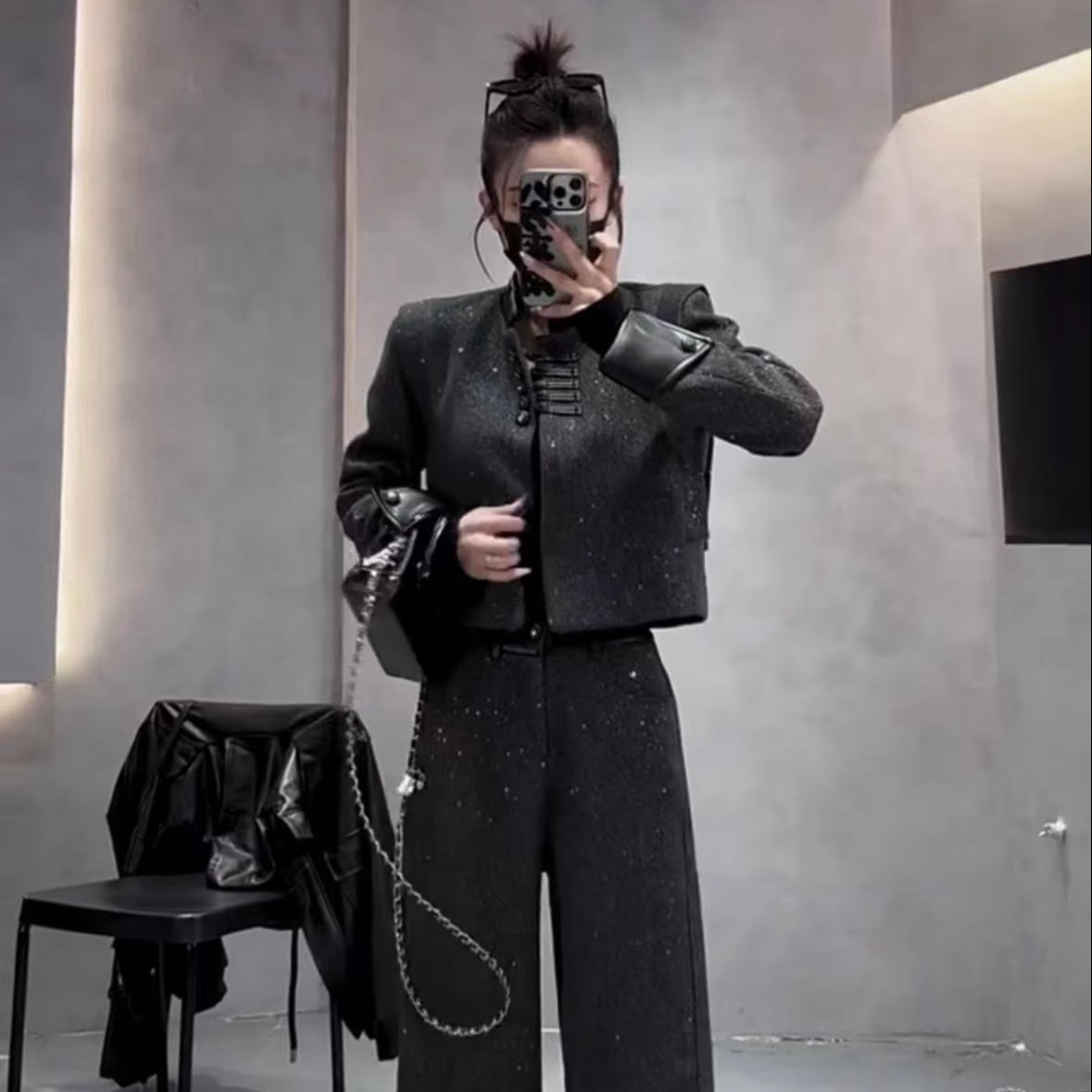 2025春秋冬新款唐装中式国潮风时尚套装女呢外套加棉阔腿裤两件套