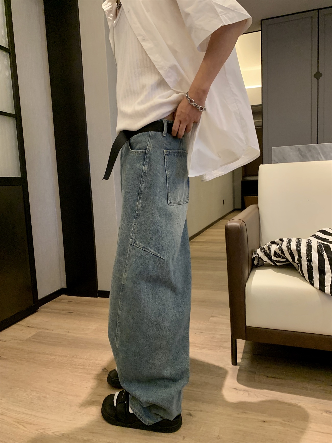 晨树 重工立体剪裁 潮牌水洗蓝休闲牛仔裤宽松美式街头直筒长裤男