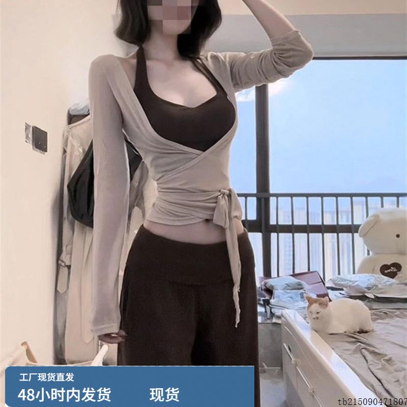 设计感小众修身交叉系带开衫女早秋季挂脖吊带背心百搭休闲裤套装