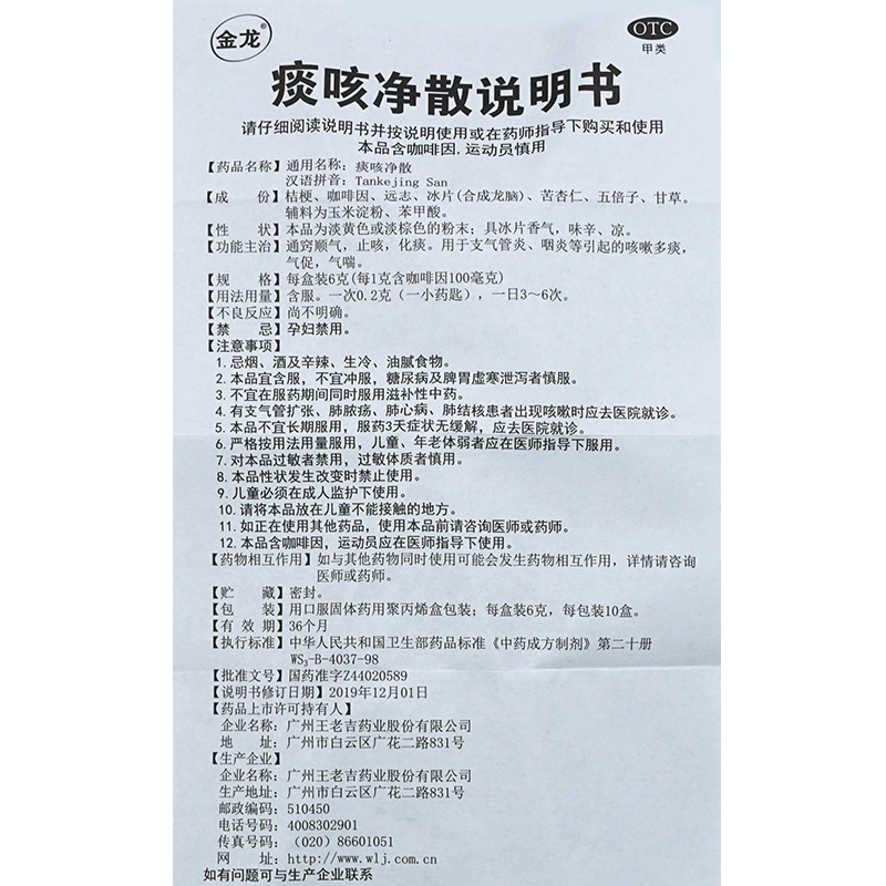 王老吉金龙痰咳净散6g/盒止咳散中药化痰咳嗽咽喉痛咽炎支气管炎