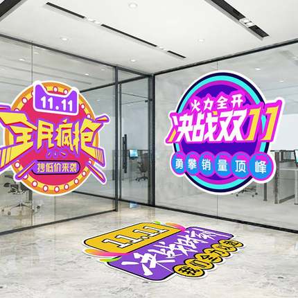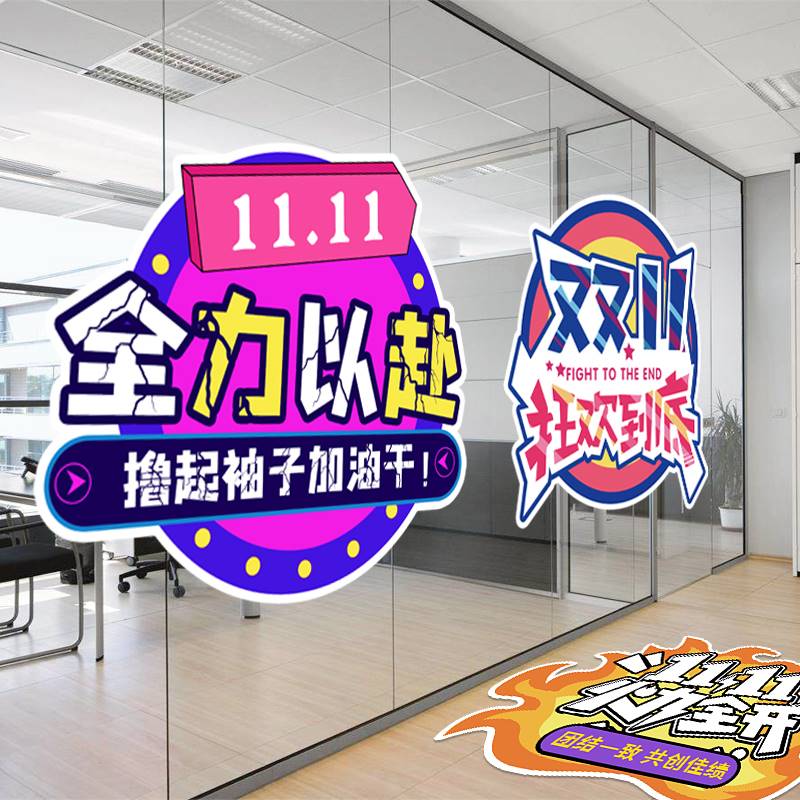 极速双十一氛围布置公司办公室激励员工玻J璃贴纸职场静电贴双11