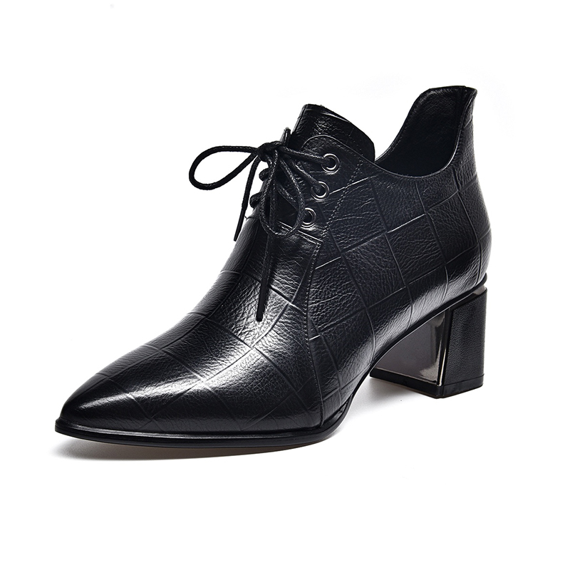 头层牛皮真皮单鞋女鞋皮鞋子新款压花格子粗跟系带深口英伦风皮鞋