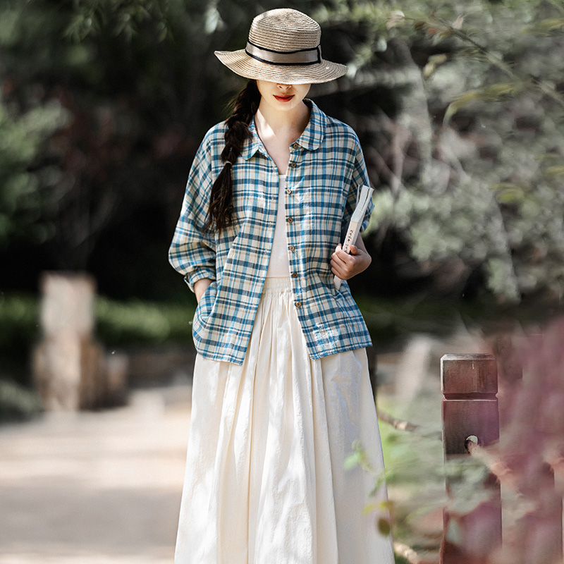 【知书】复古纯棉格子衬衫女春季2025新款宽松百搭长袖衬衣短外套