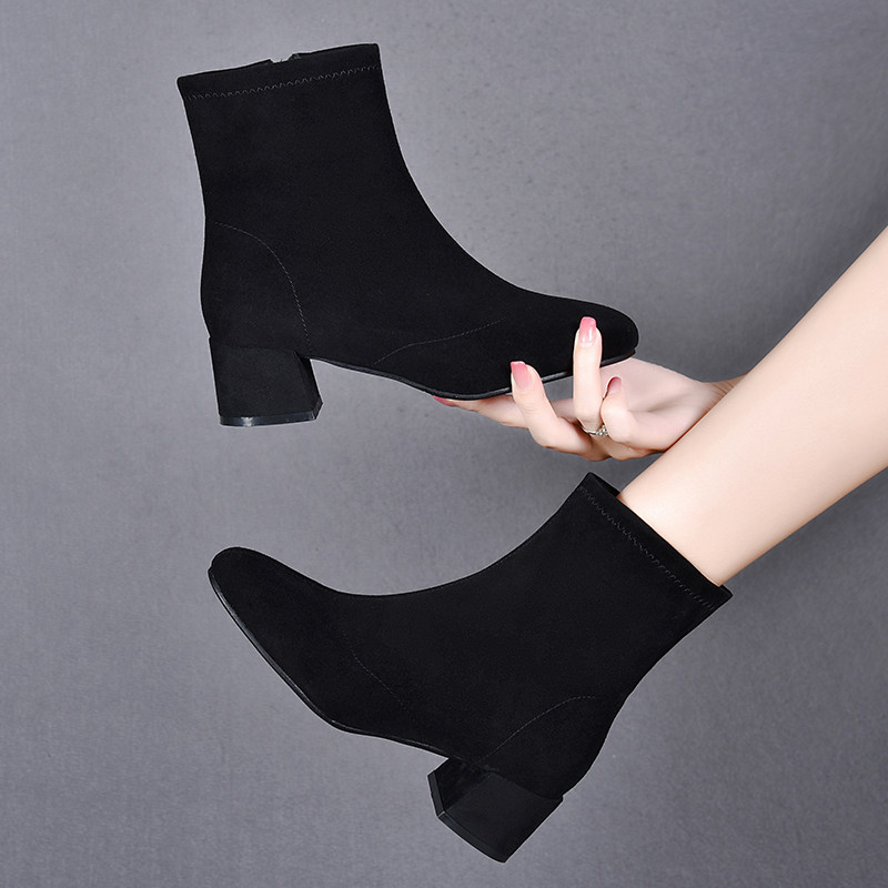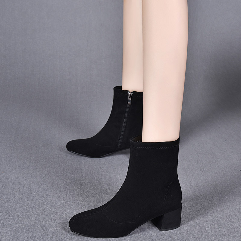 真皮磨砂短靴女2025新款粗跟春秋单靴圆头绒面黑色瘦瘦靴冬季加绒