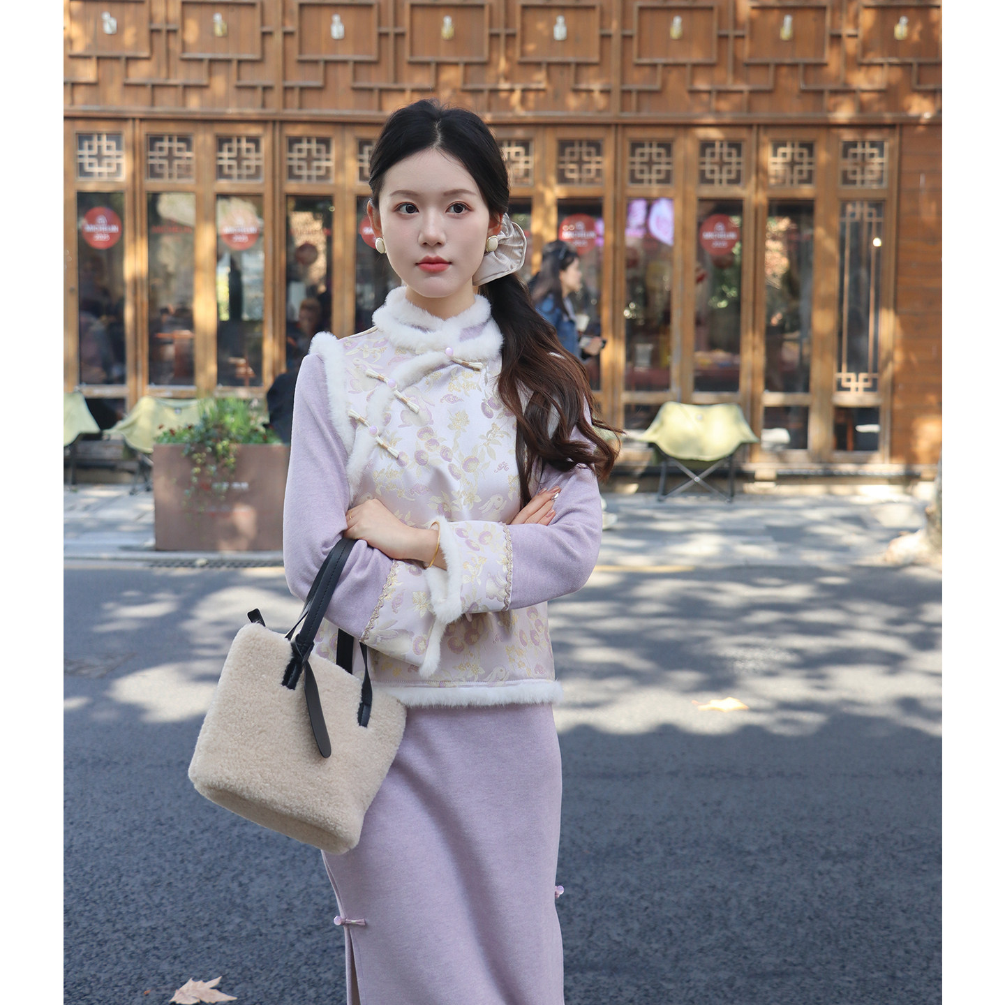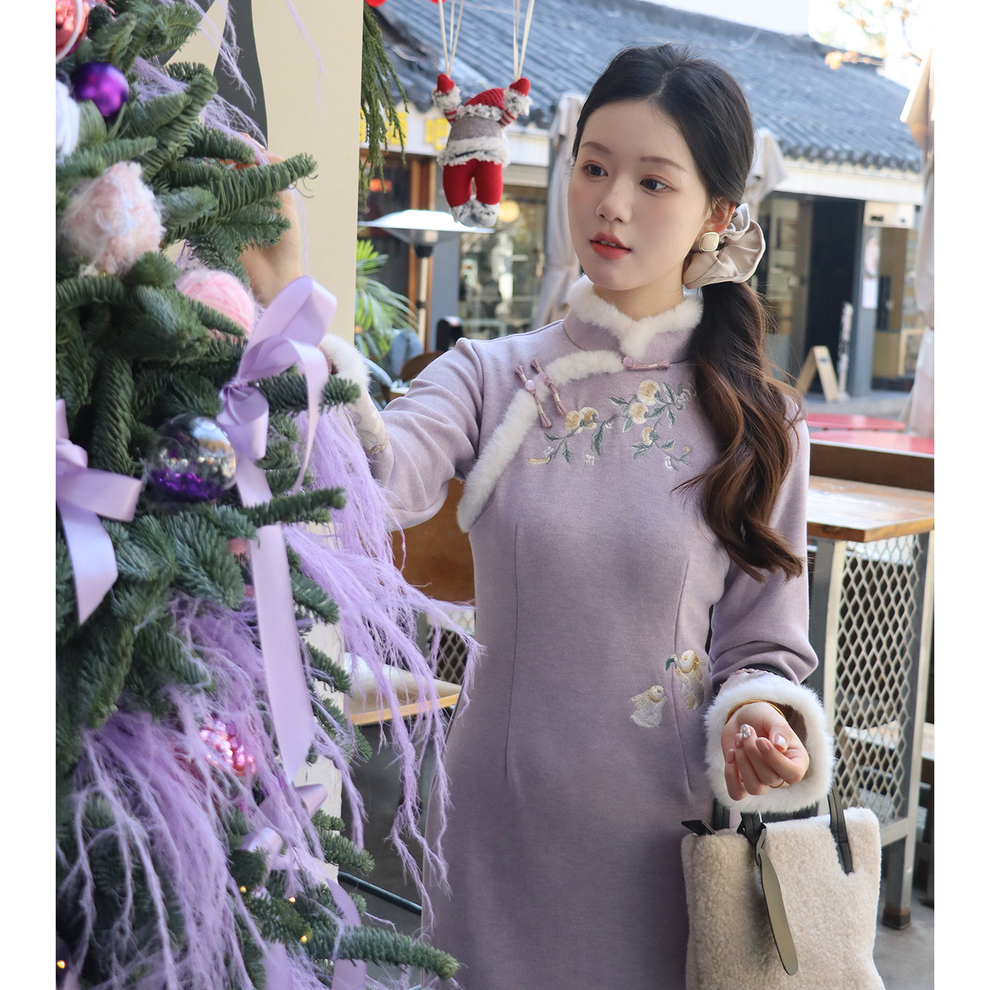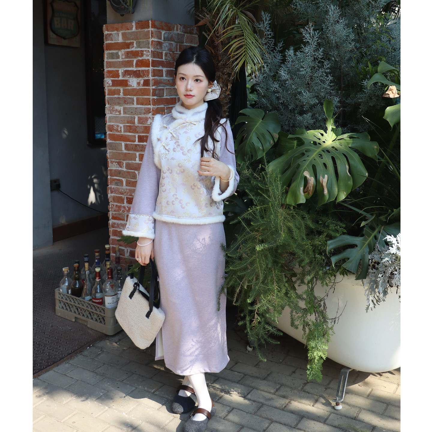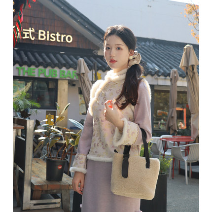 紫小兔新中式旗袍冬季加绒加厚2025新马甲套装保暖女优雅紫色显白
