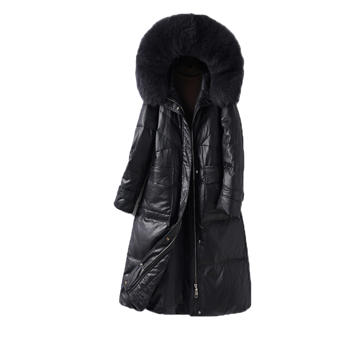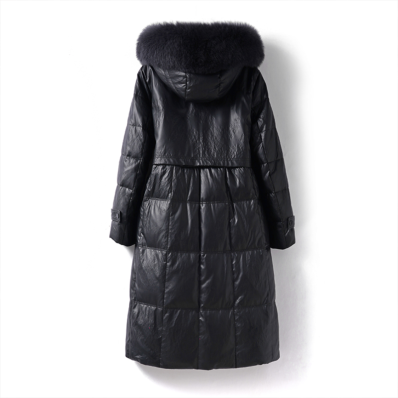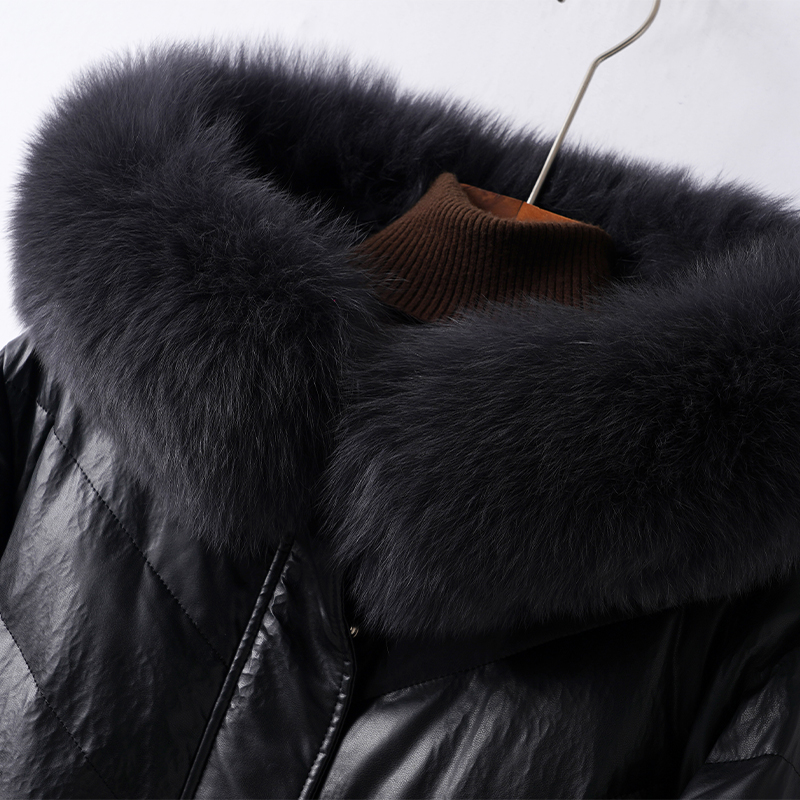 羽绒服女中长真皮外套连帽狐狸毛领宽松白鸭绒海宁新款绵羊皮衣