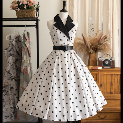 【午后森林】森林衣橱复古法式夏大摆裙西装领削肩袖赫本风连衣裙