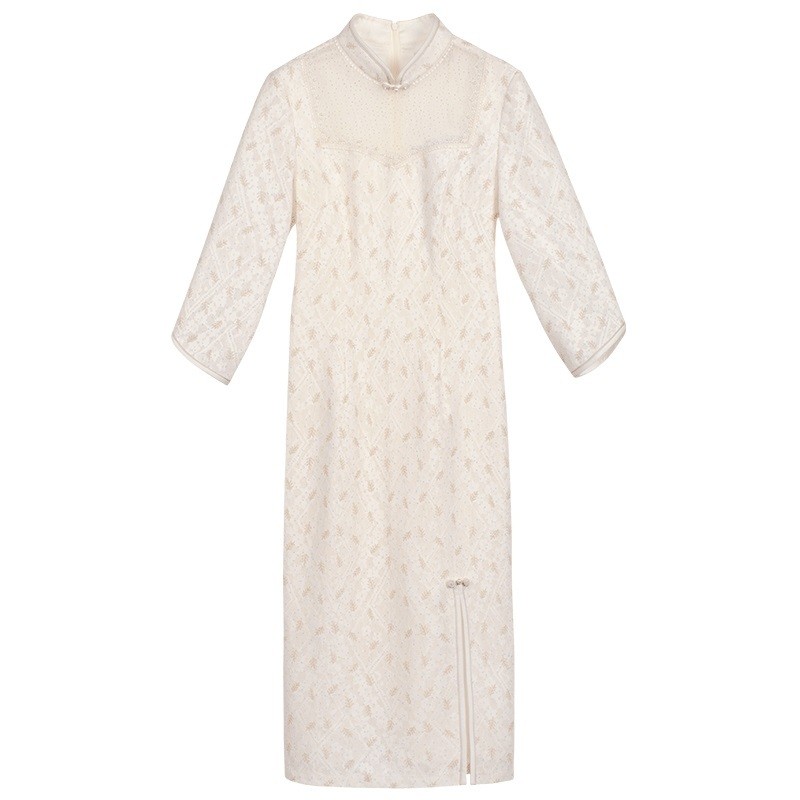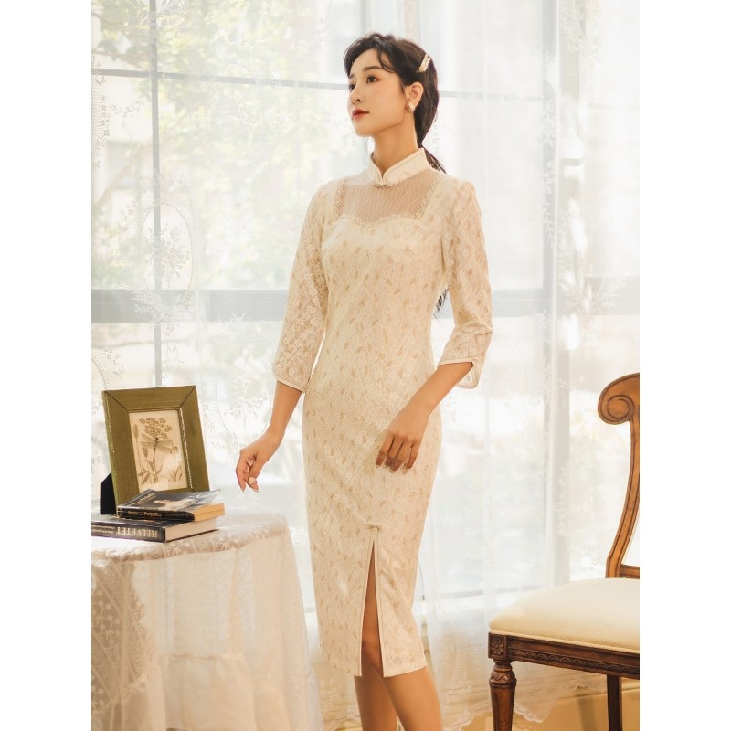 固执春季新款通勤蕾丝拼接年轻款改良旗袍碎花连衣裙女