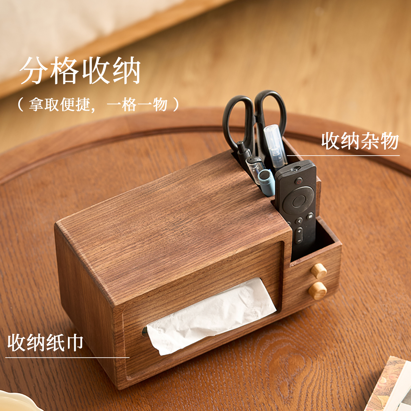 黑胡桃实木纸巾盒多功能遥控器收纳家用客厅茶几创意木质抽纸盒