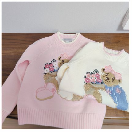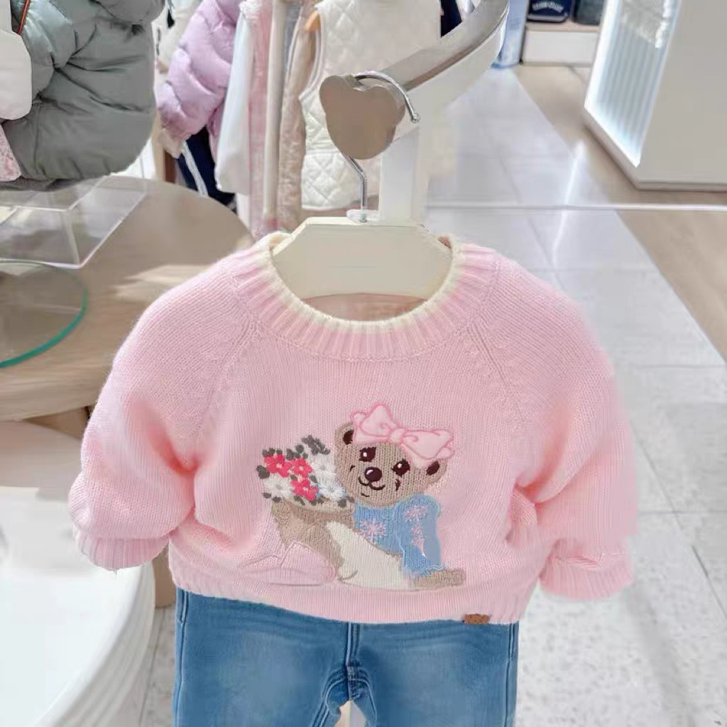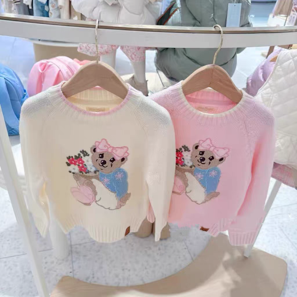 含羊毛的 配色好美!110-160女童秋冬重工刺绣卡通花朵熊套头毛衣