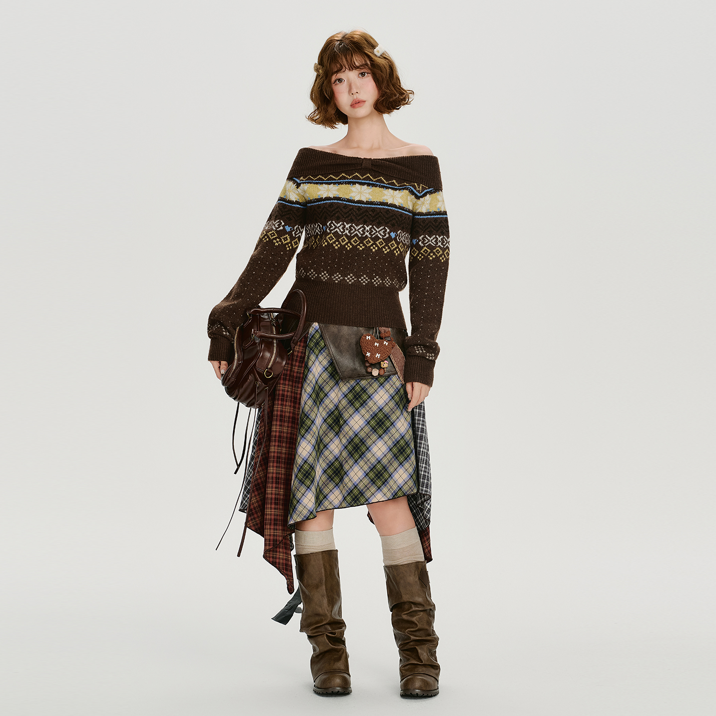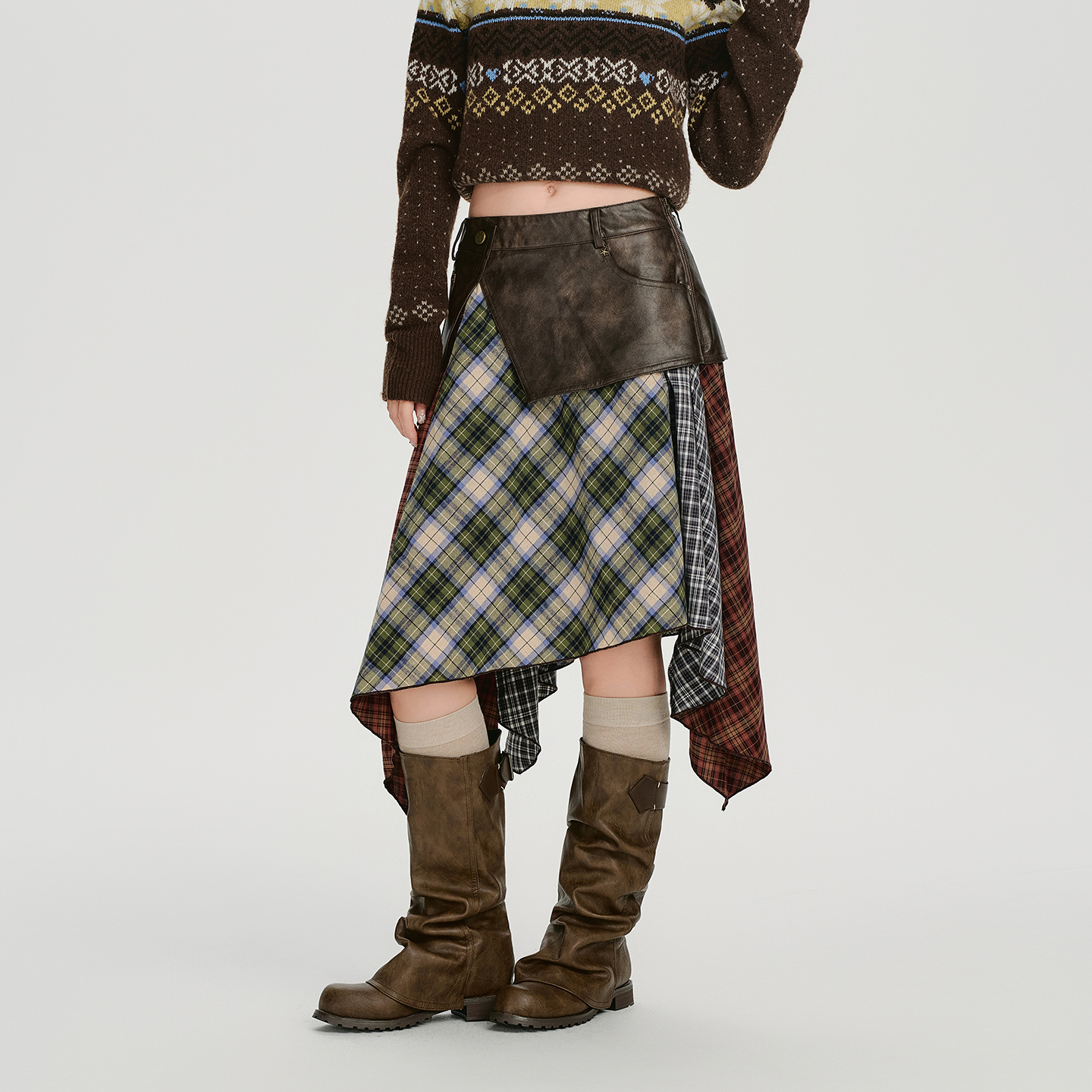 Girlyhalo美式复古皮革拼接格纹不规则半身裙女秋新款设计感半裙