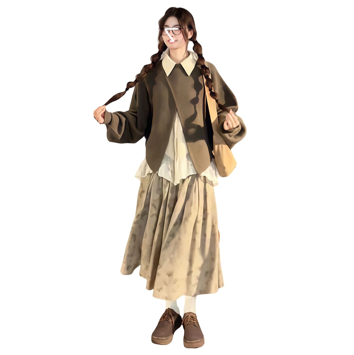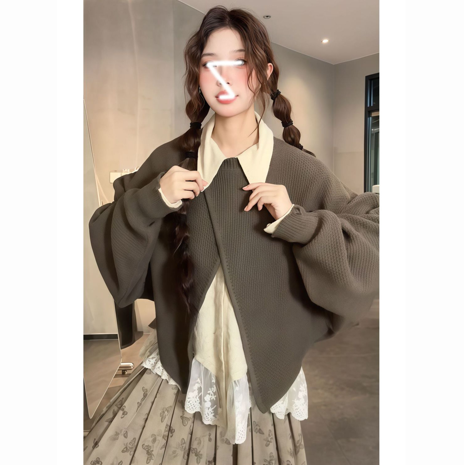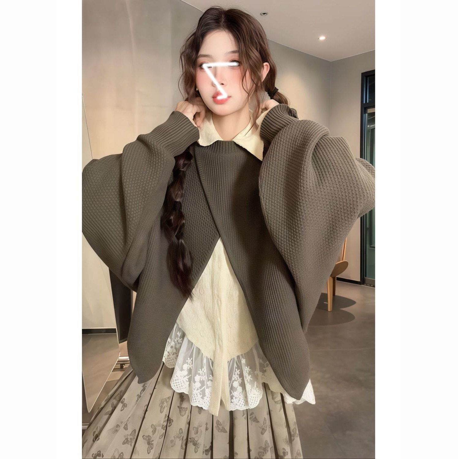 秋冬森系复古蝙蝠袖开叉套头宽松针织毛衣搭配蕾丝长袖开衫两件套