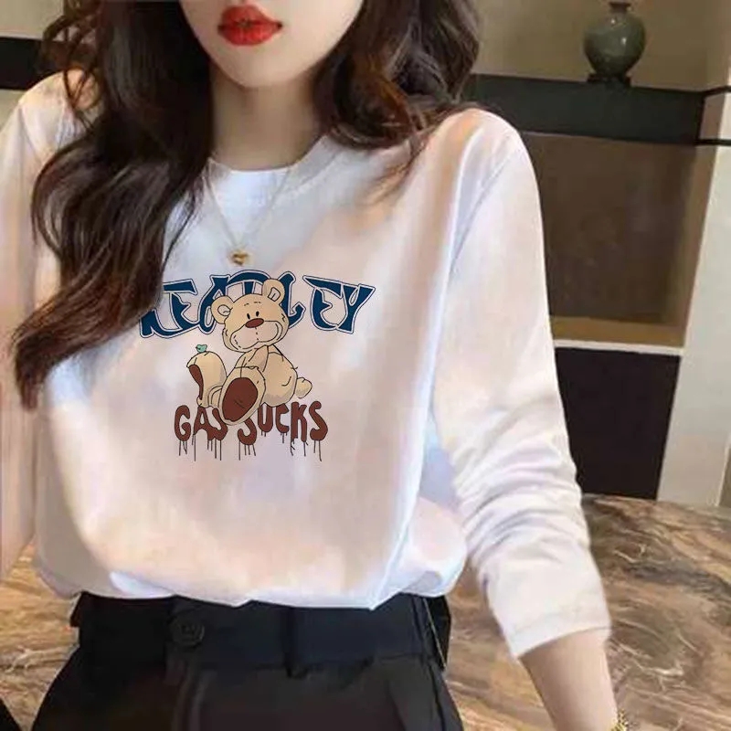 纯棉长袖上衣女潮ins百搭韩版宽松白色打底衫女潮流新款印花t恤女