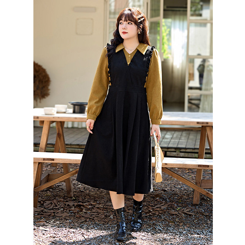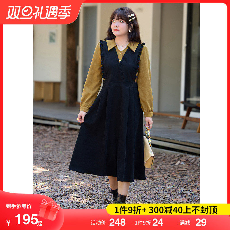 大码女装假两件套装磨毛连衣裙秋冬新款法式气质收腰显瘦胖mm长裙