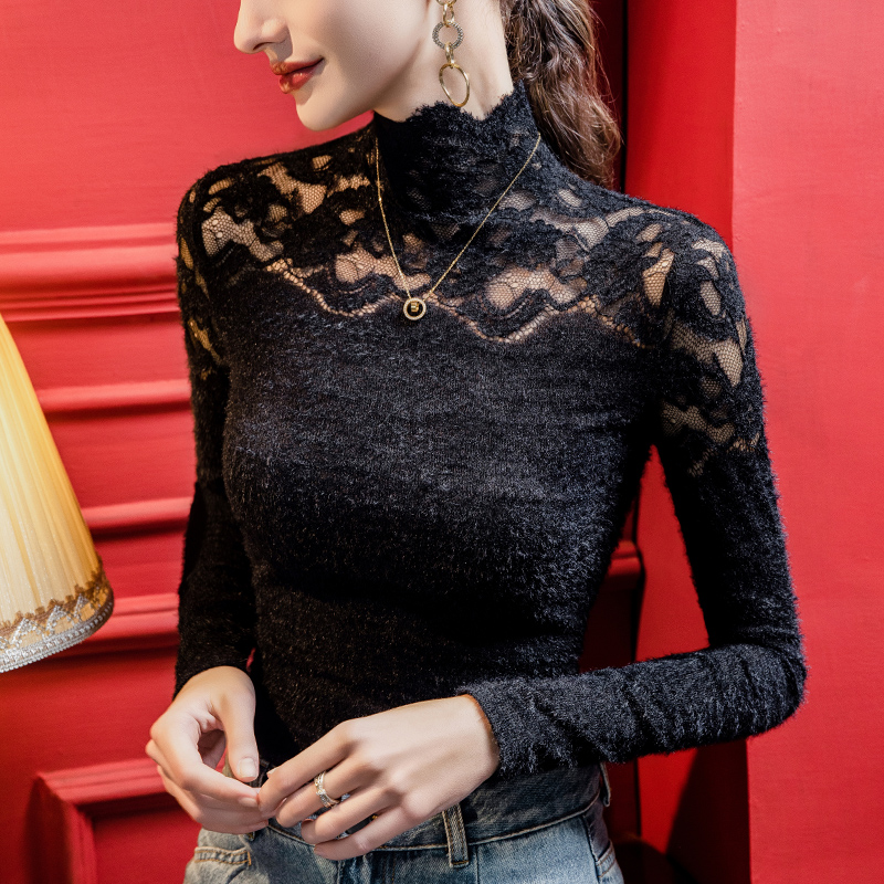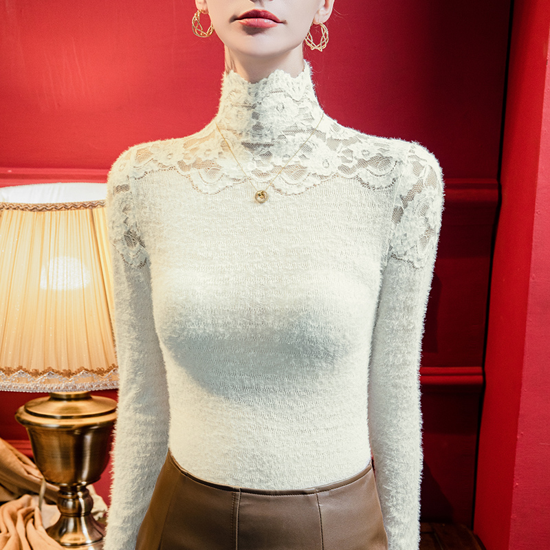 冬季花瓣高领镂空蕾丝打底衫女