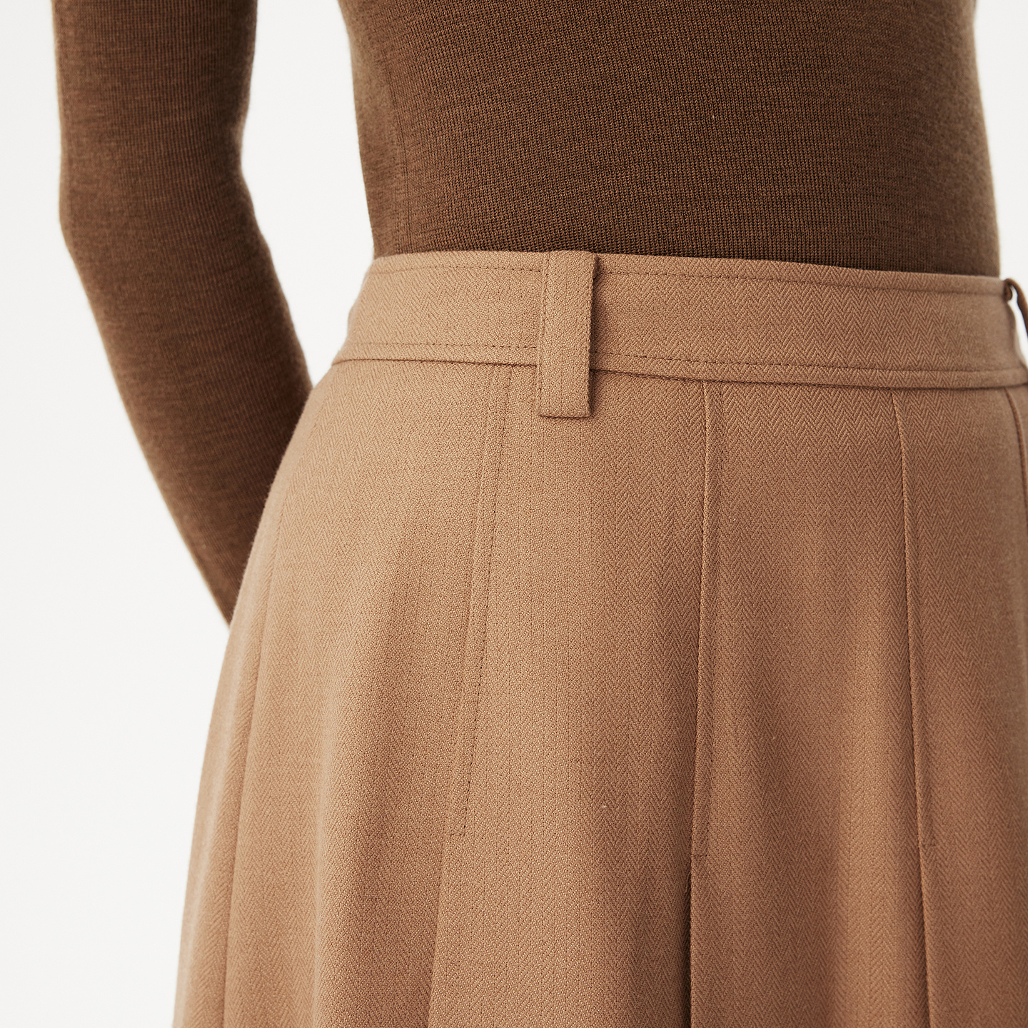 VGRASS25冬季新款骆驼绒薄呢定位压褶A字半身裙长半裙百褶裙女装