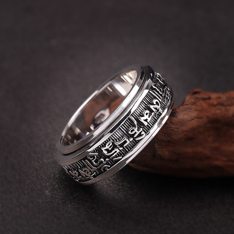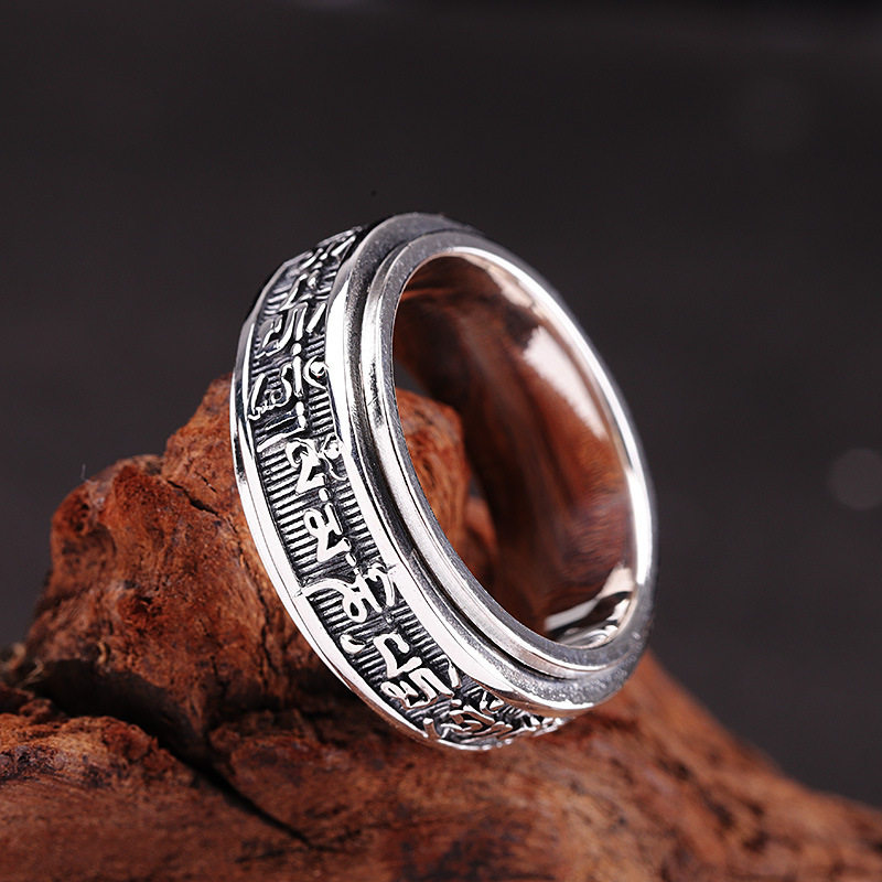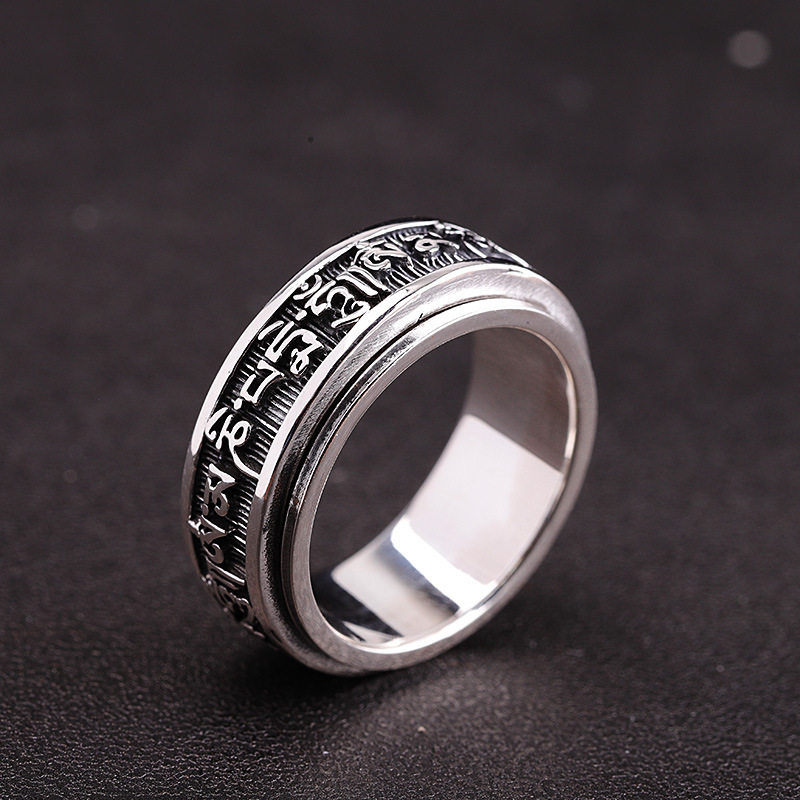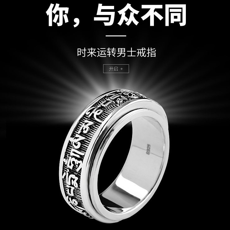 S999纯银藏文转运情侣戒指男士霸气个性食尾指环复古单身转动潮人