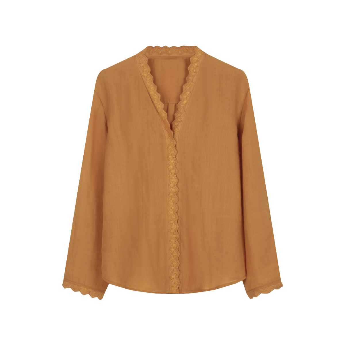 solighter法式苎麻花边V领衬衫