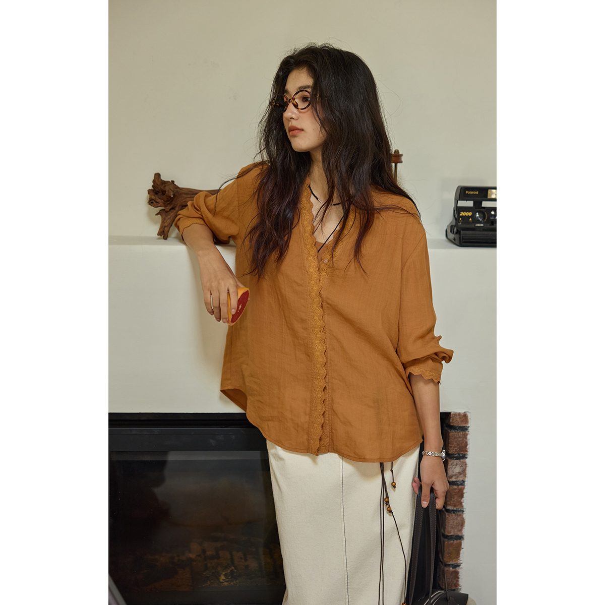 solighter 法式苎麻花边V领长袖衬衫女秋季2025新款宽松衬衣上衣