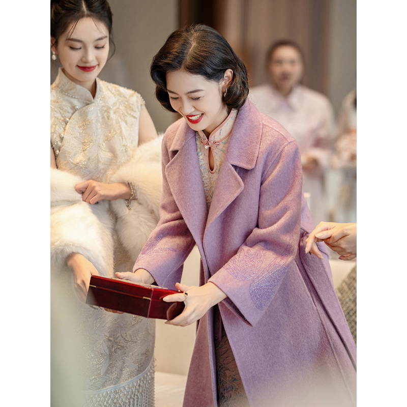 紫色妈妈婚宴装羊绒大衣女秋冬结婚高级感喜婆婆中长款呢子外套