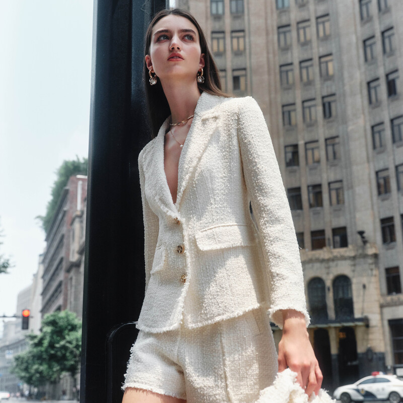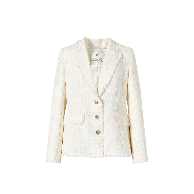 商场同款摩萨克春装翻领白色法式粗花呢收腰气质小香风外套女