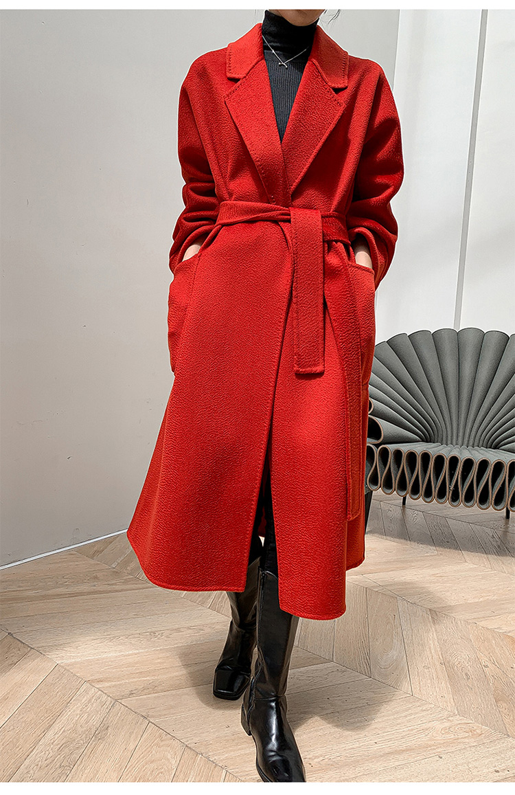 新款水波纹双面羊绒大衣女中长款高端气质双面羊毛呢系带时尚外套