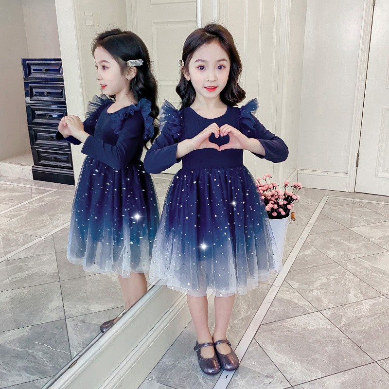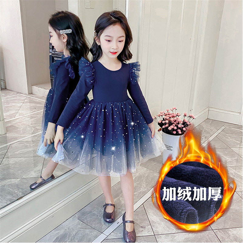 女童秋冬装新款2024洋气星空渐变长袖加绒连衣裙公主裙蓬蓬纱裙