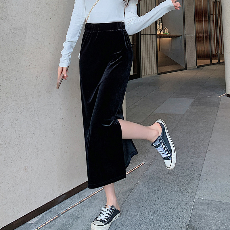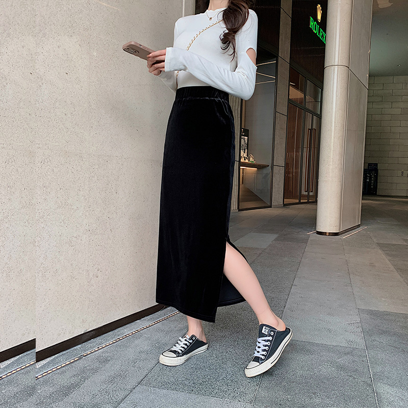 金丝绒侧开叉半身裙女春秋长款高腰显瘦包臀裙黑色大码直筒一步裙
