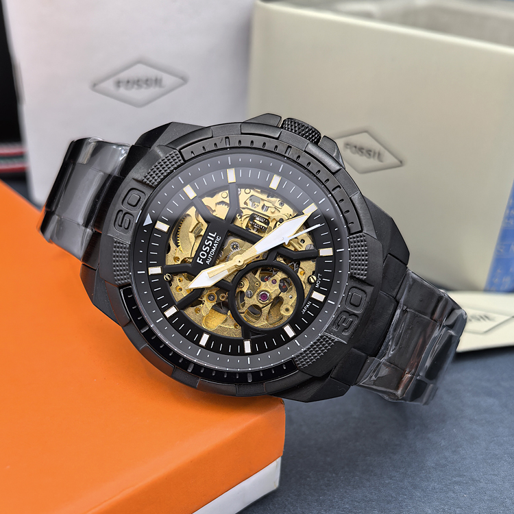 FOSSIL手表不锈钢酷黑镂空自动机械表金色机芯商务休闲男表ME3217