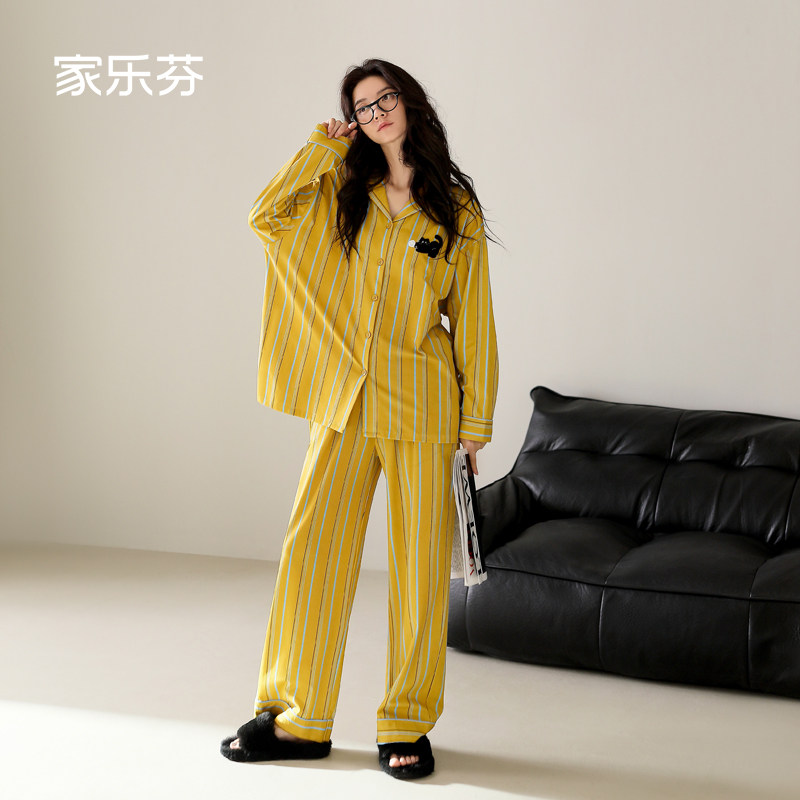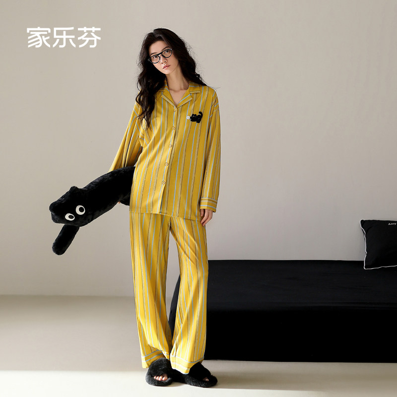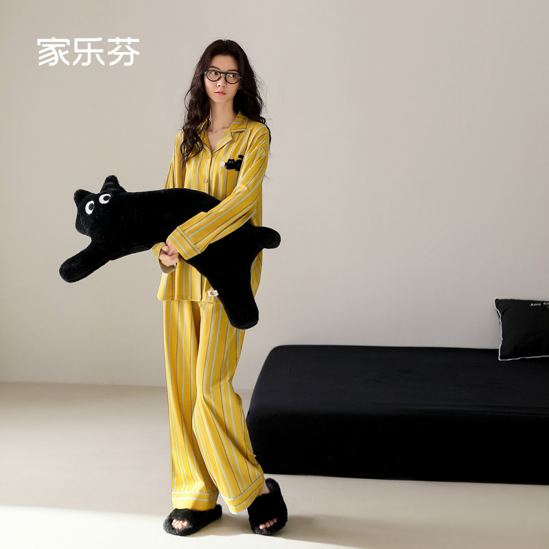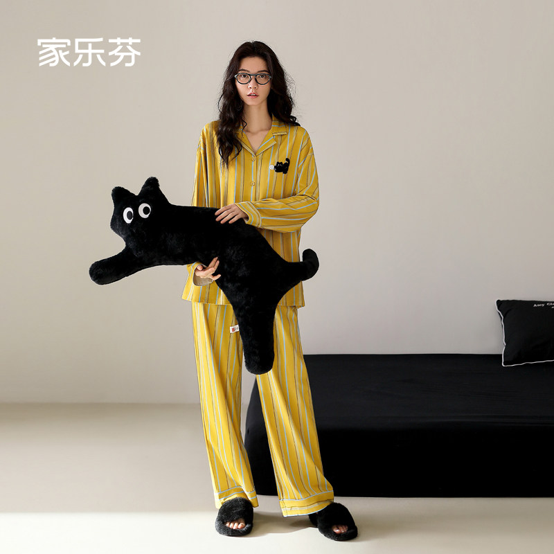 家乐芬睡衣女士春秋季纯棉长袖家居服小黑猫印花条纹时尚开衫套装