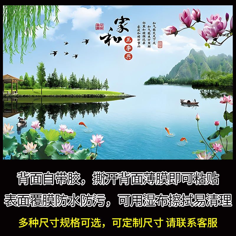 新中式山水风景壁画防水自粘墙贴风水招财客厅电视背景墙装饰贴画