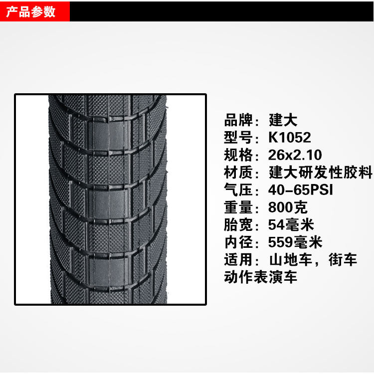 建大K1052自行车轮胎26x2.1山地车外胎攀爬街车动作车半光头山马