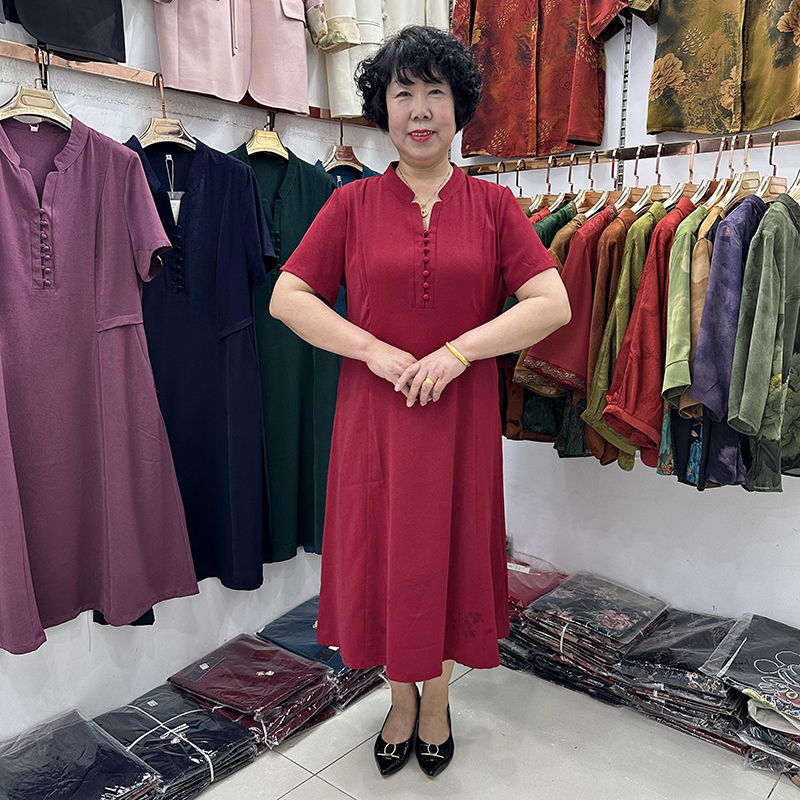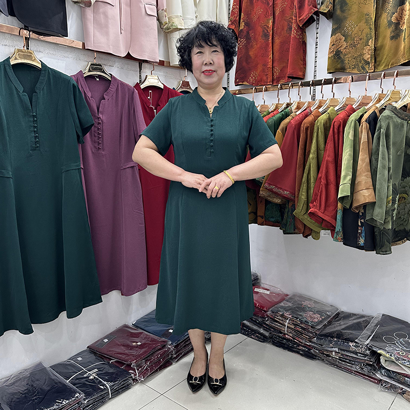 妈妈桑蚕丝V领夏装短袖连衣裙