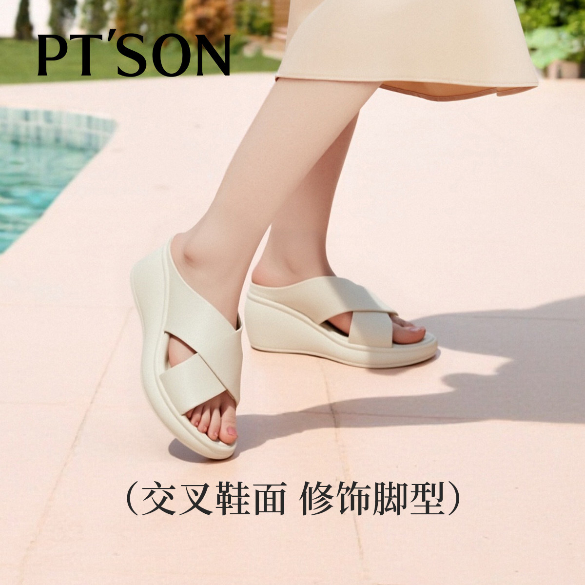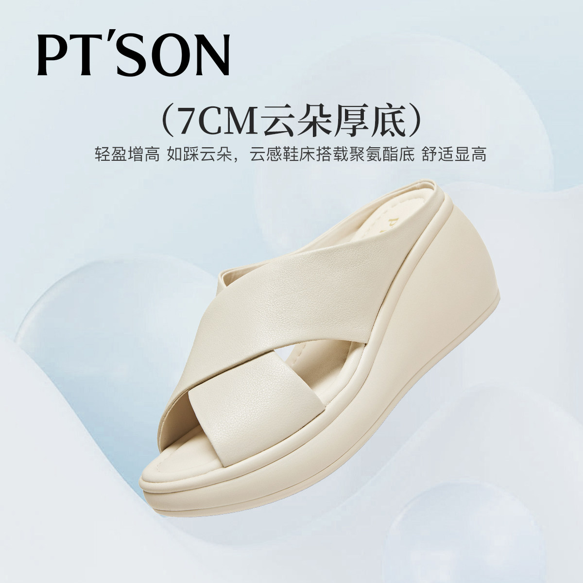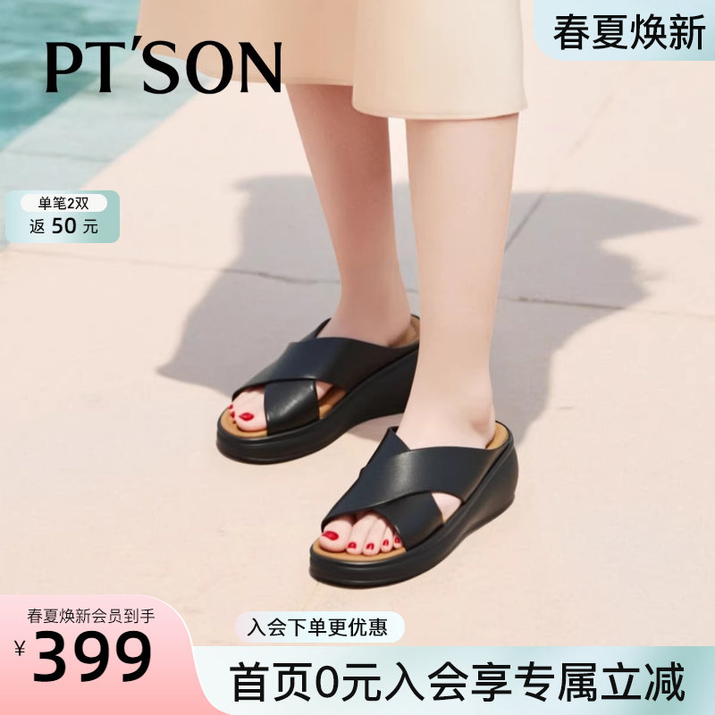 商场同款百田森牛皮拖鞋女夏季新款厚底坡跟交叉简约高跟拖鞋