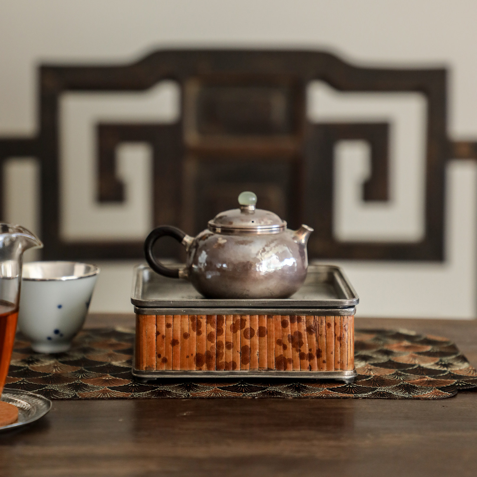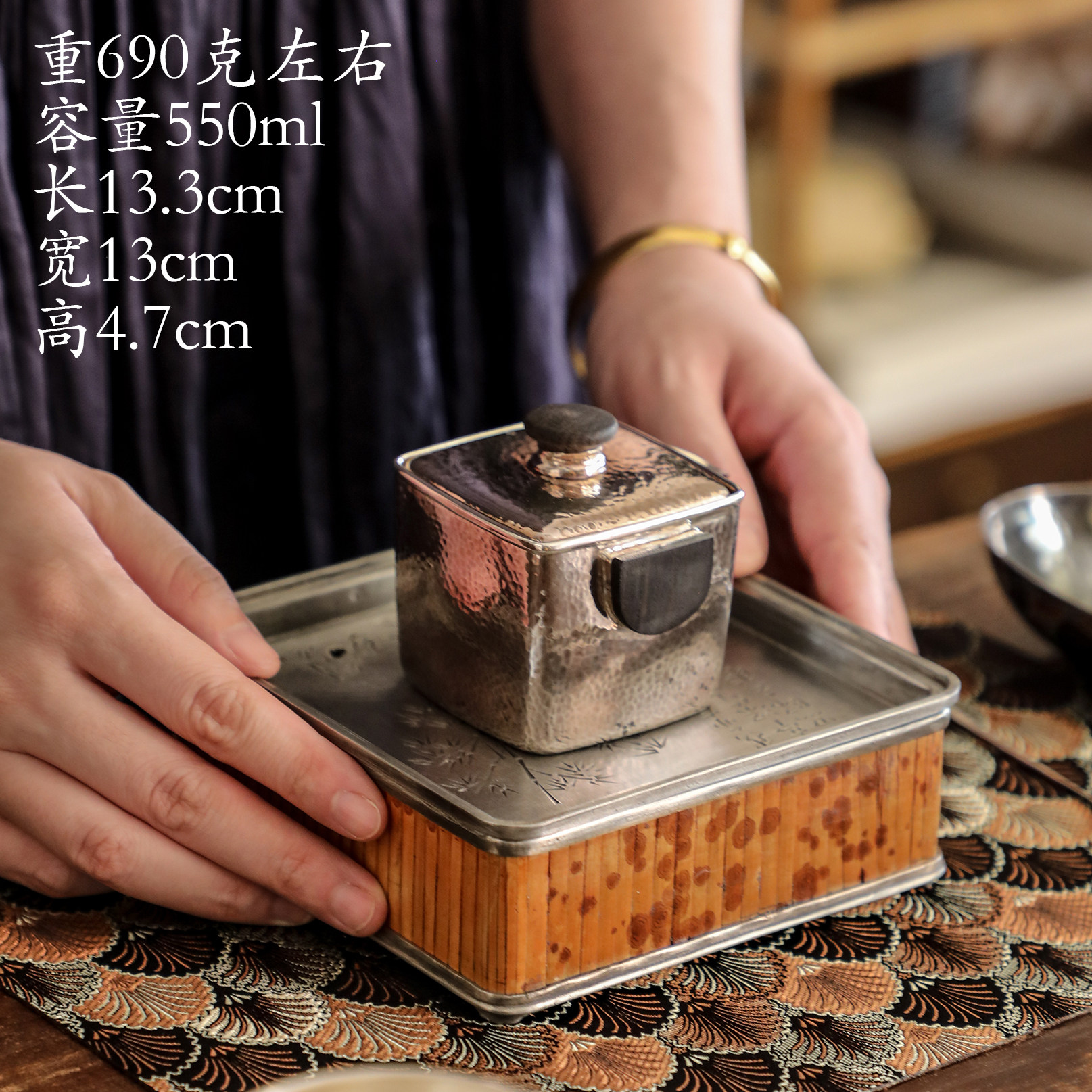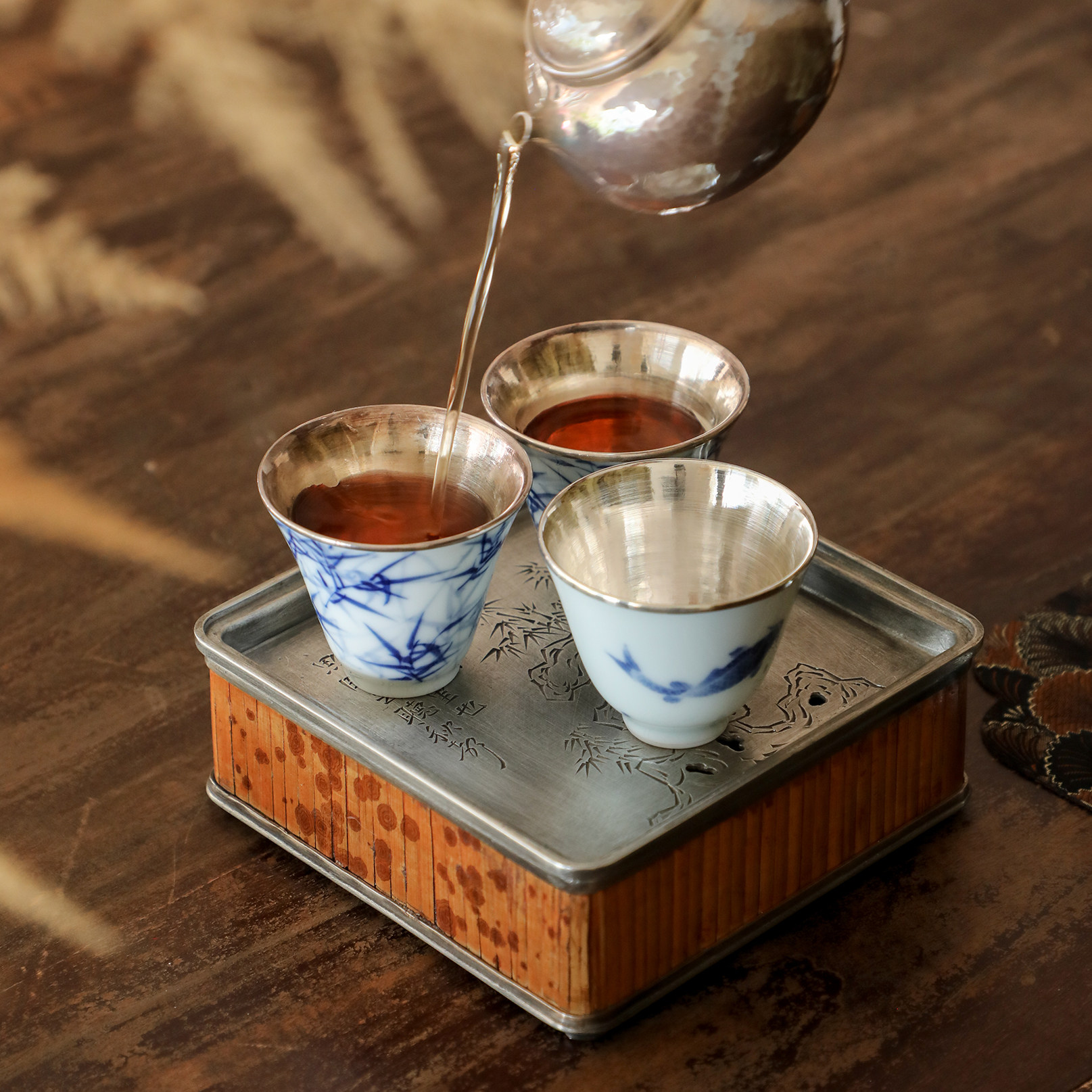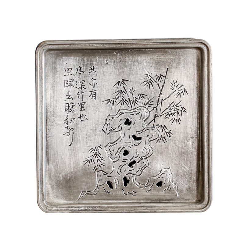 纯银时代湘妃竹纯锡壶承雕刻茶盘