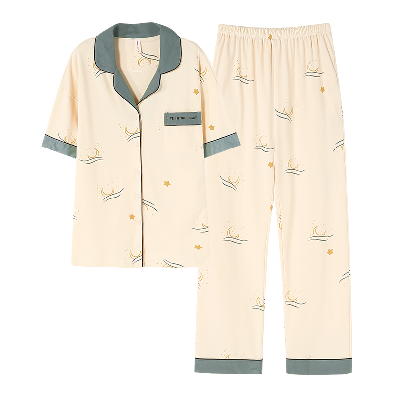浪莎睡衣女纯棉开衫短袖长裤套装