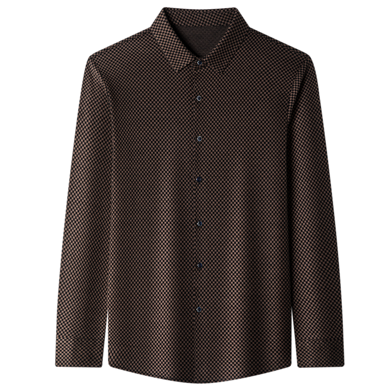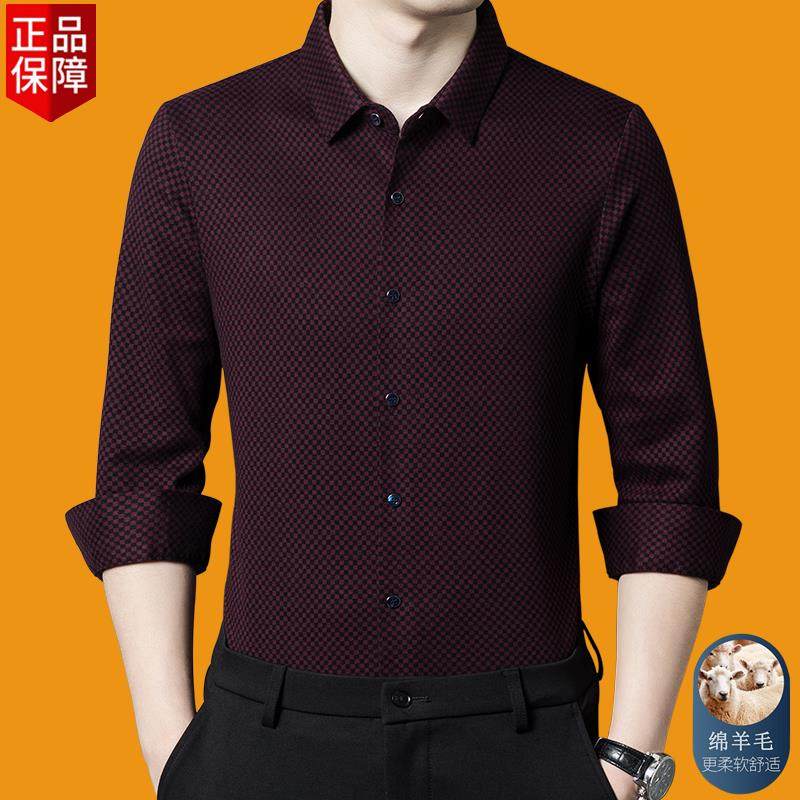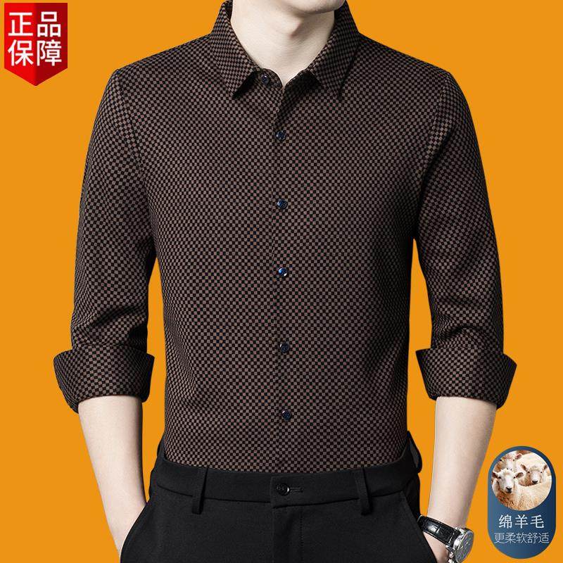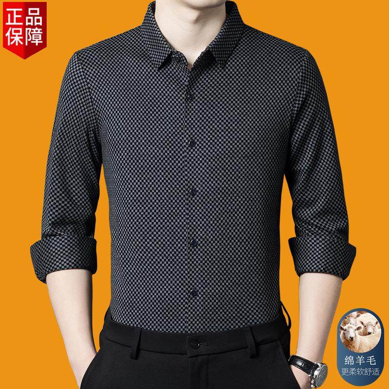 秋冬季皮尔卡丹男羊绒长袖衬衫高档商务休闲格子抗皱加厚保暖衬衣