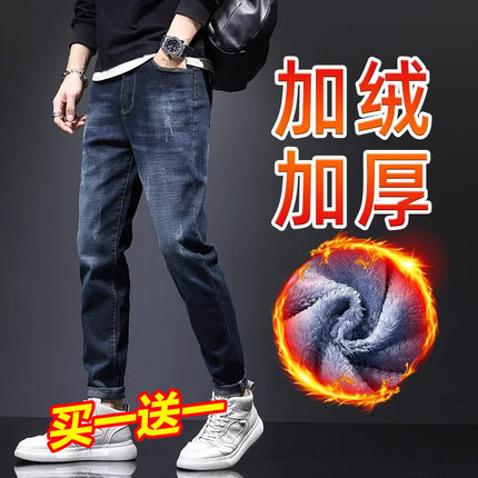 Yishion以纯官方时尚正品男士宽松直筒牛仔裤秋冬款加厚加绒保暧
