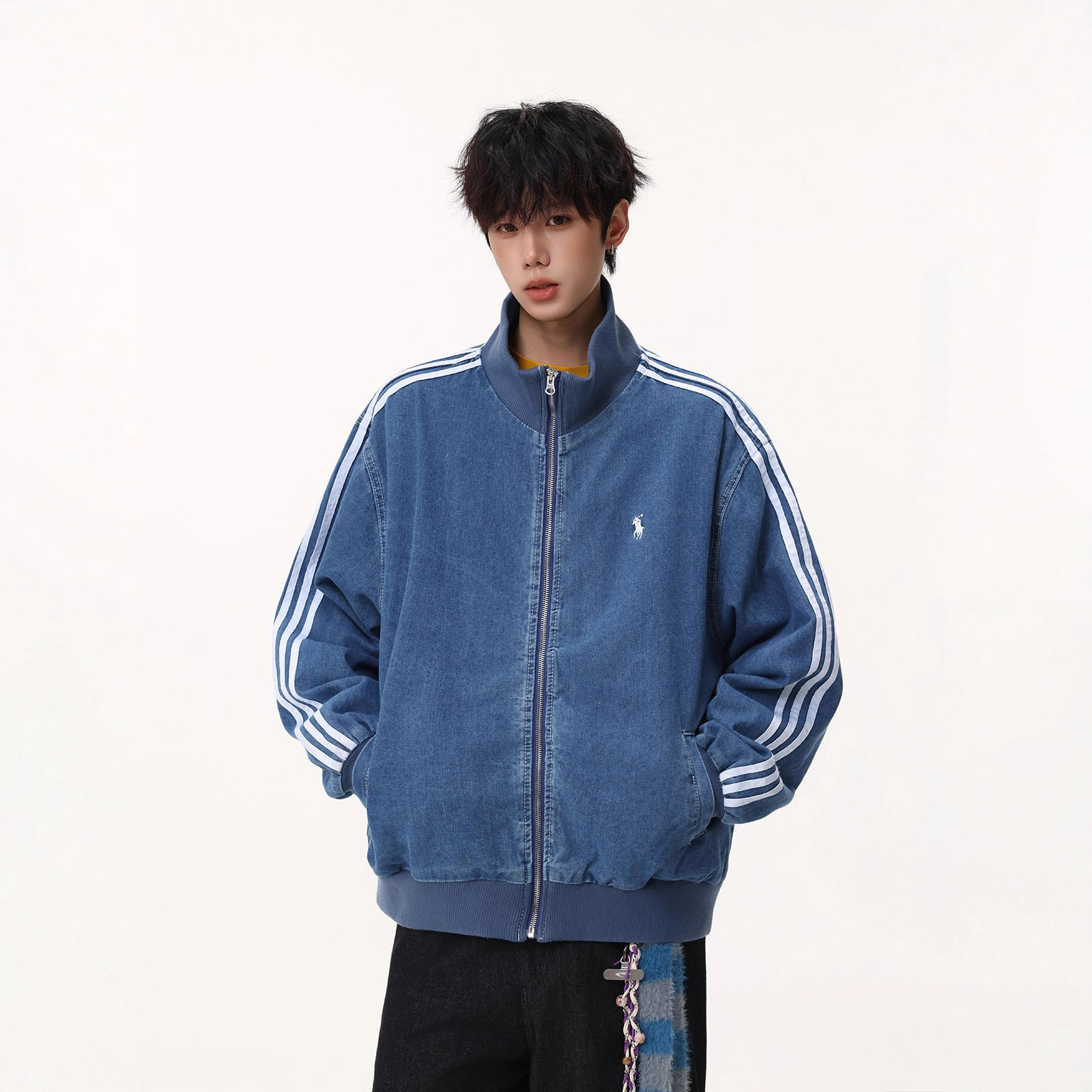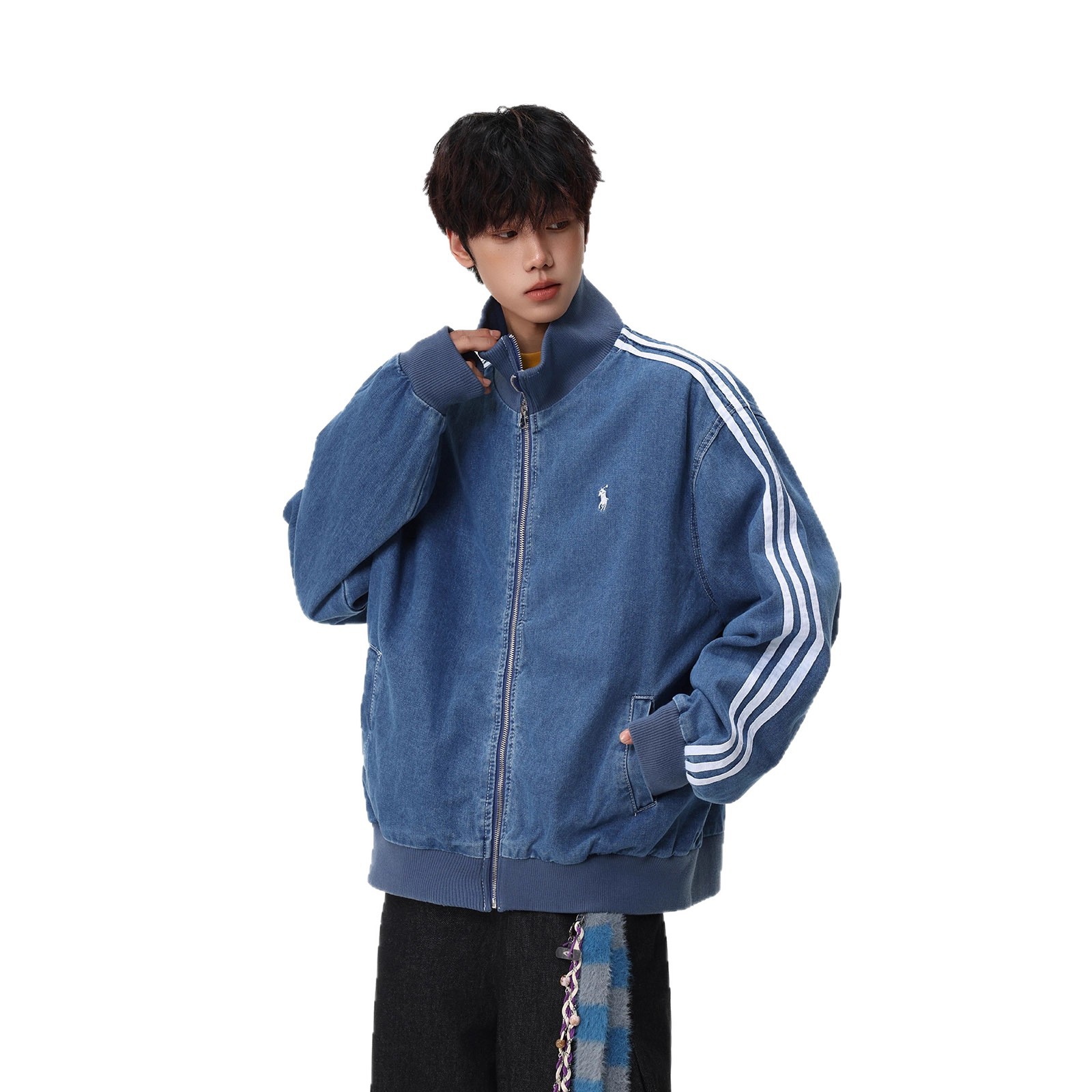 美式三道杠条纹牛仔棒球服外套男女刺绣上衣设计感高级短款夹克衫