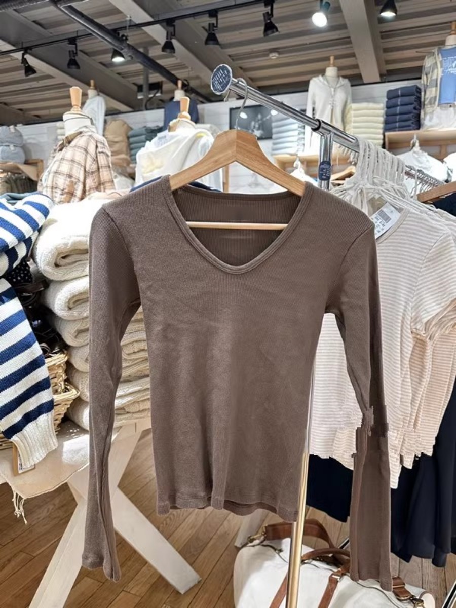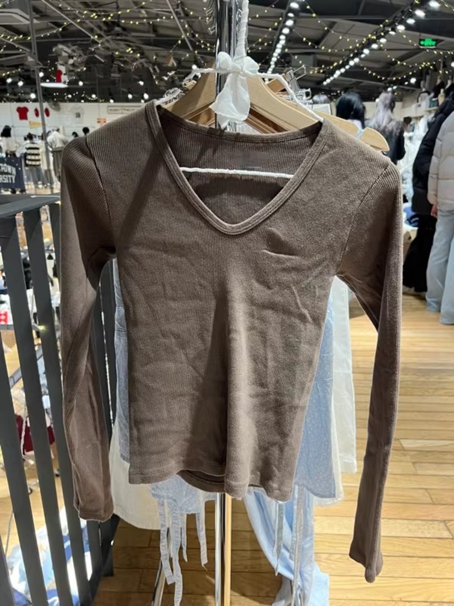 BM美式复古长袖T恤女官网春秋新款纯色V领修身显瘦百搭内搭上衣