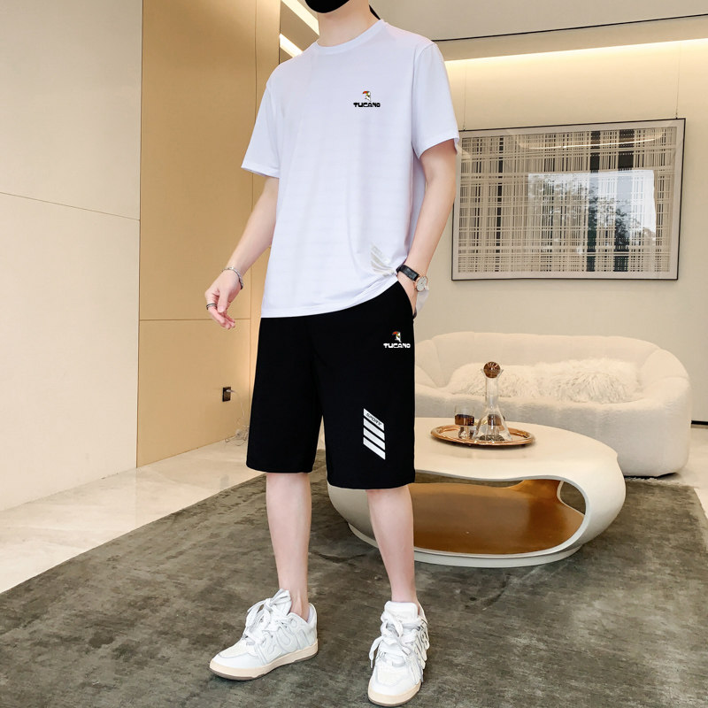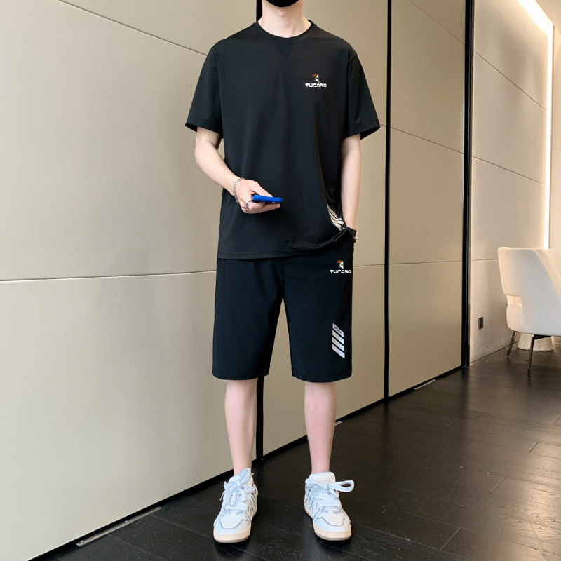 啄木鸟冰丝t恤运动套装男夏季跑步短袖短裤速干休闲一套搭配帅气