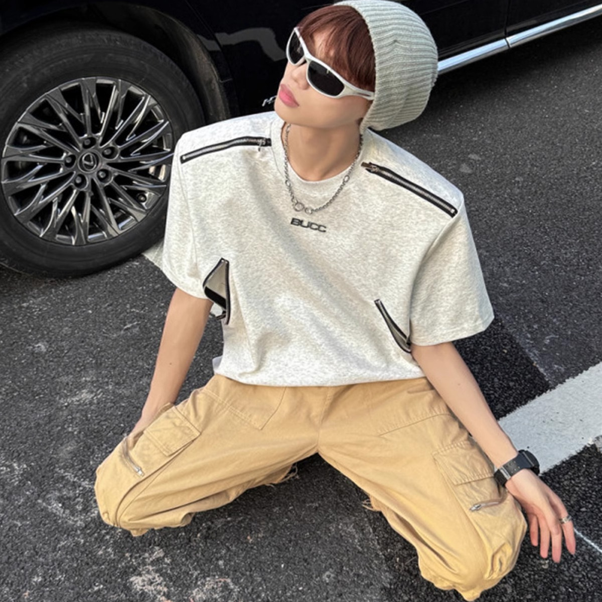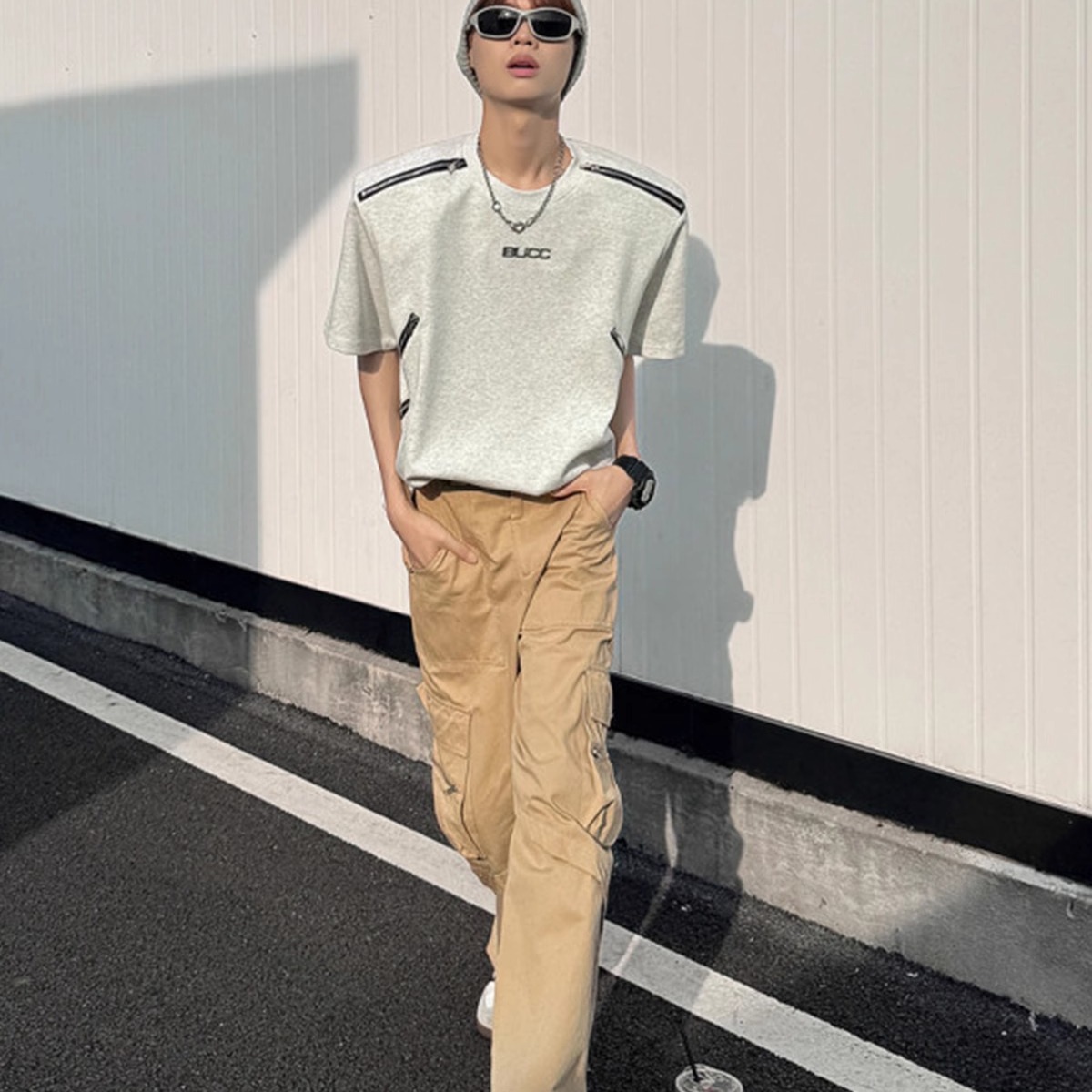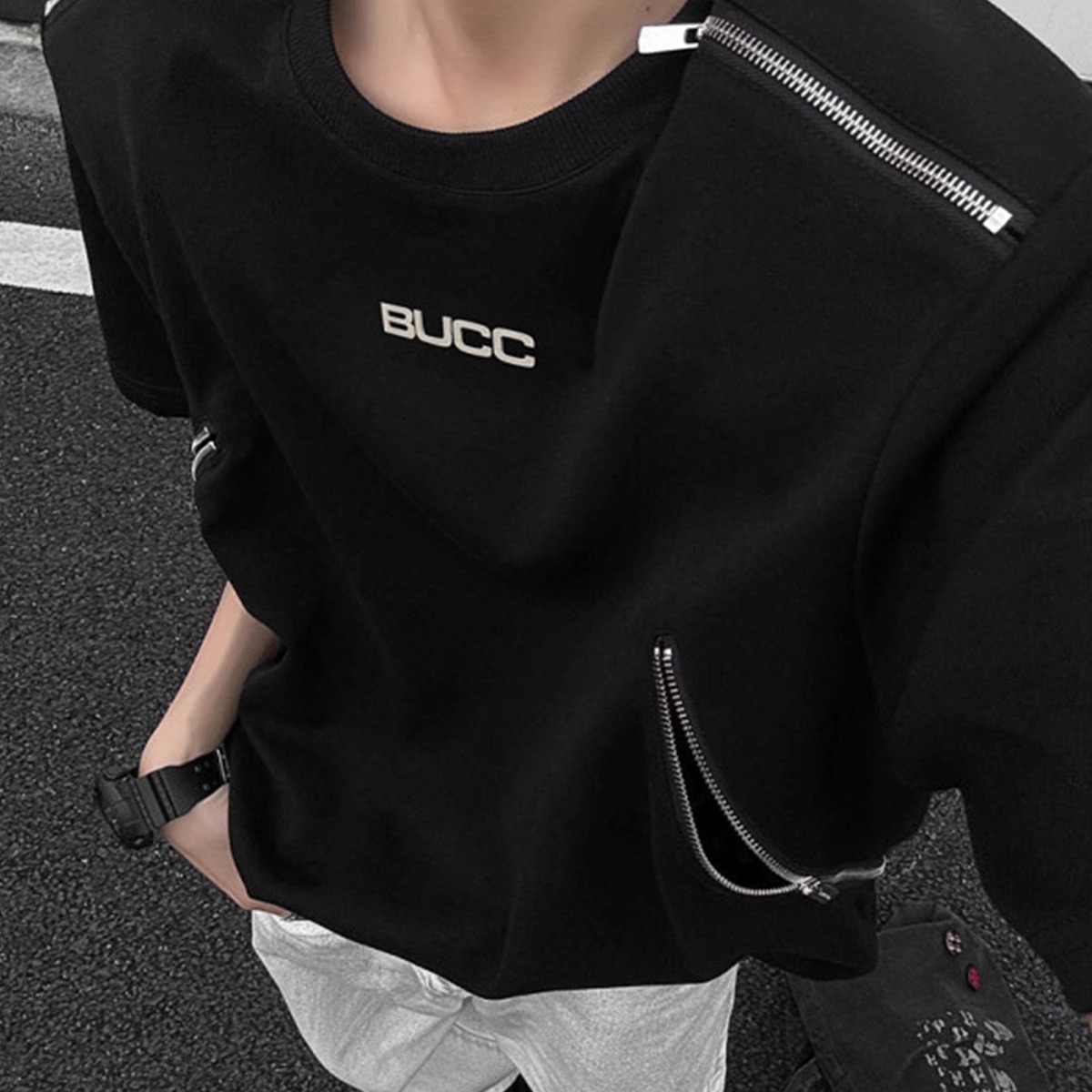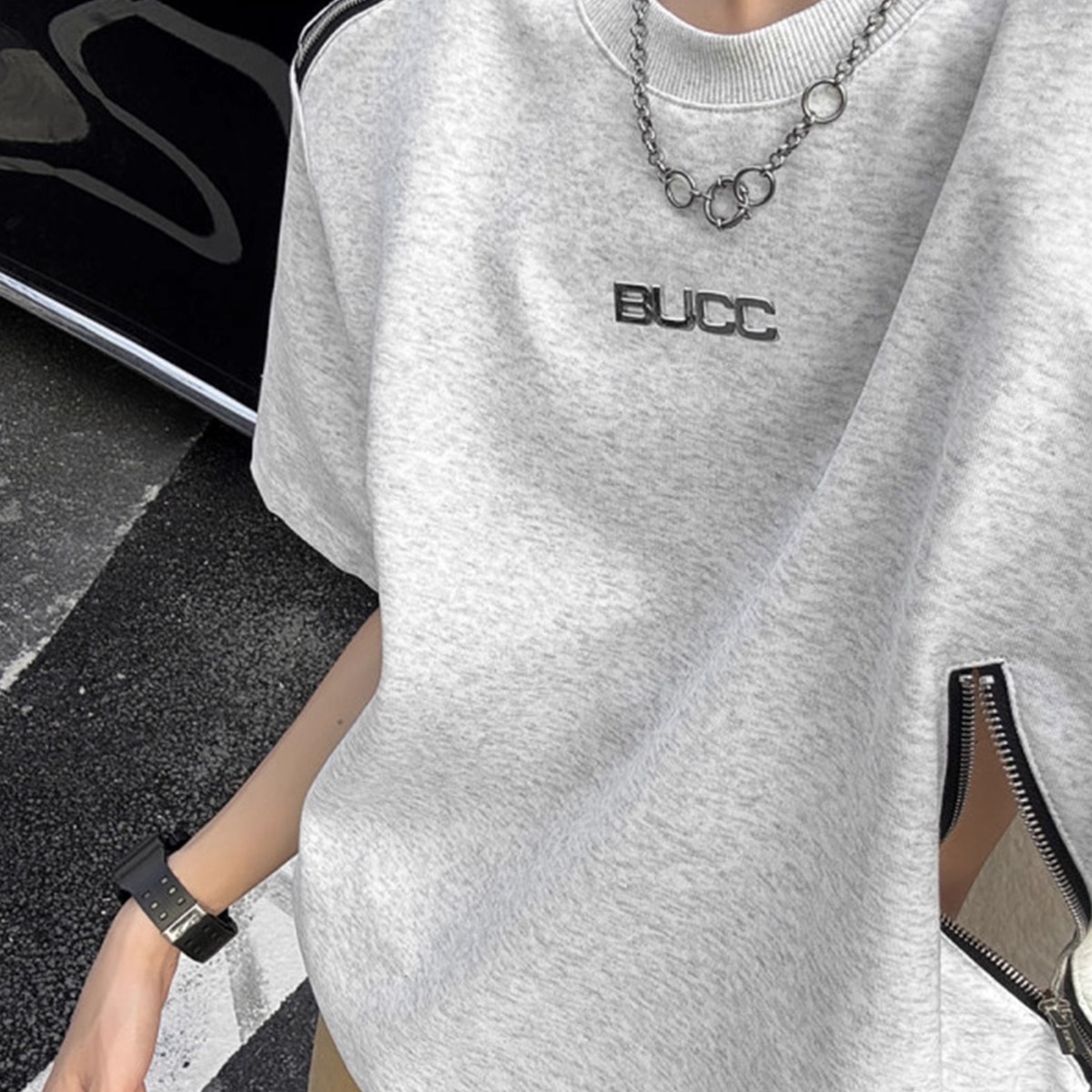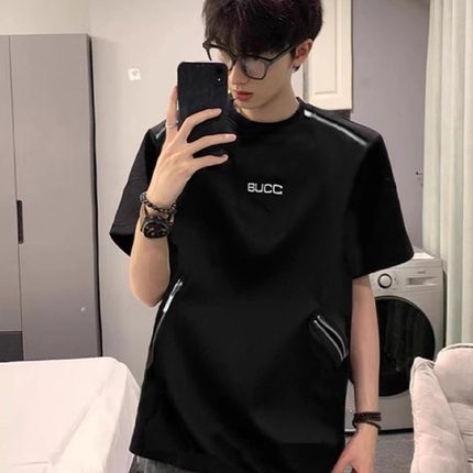 解构拉链垫肩短袖t恤男重磅半袖