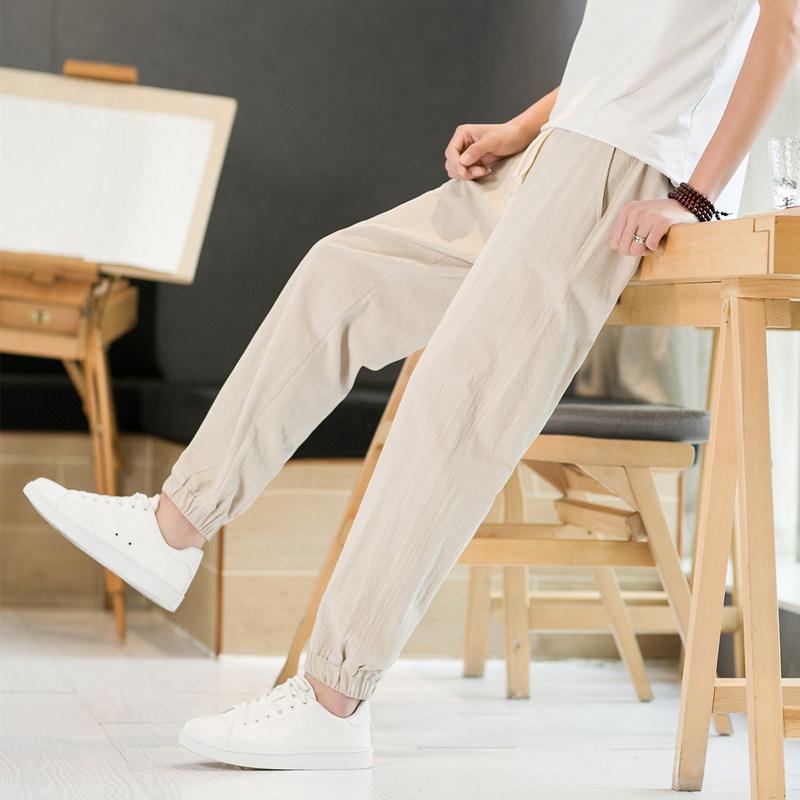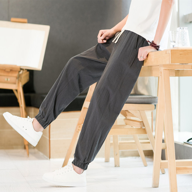 夏季男小码XS S码休闲亚麻棉裤修身九分束脚裤小码学生薄款9分裤