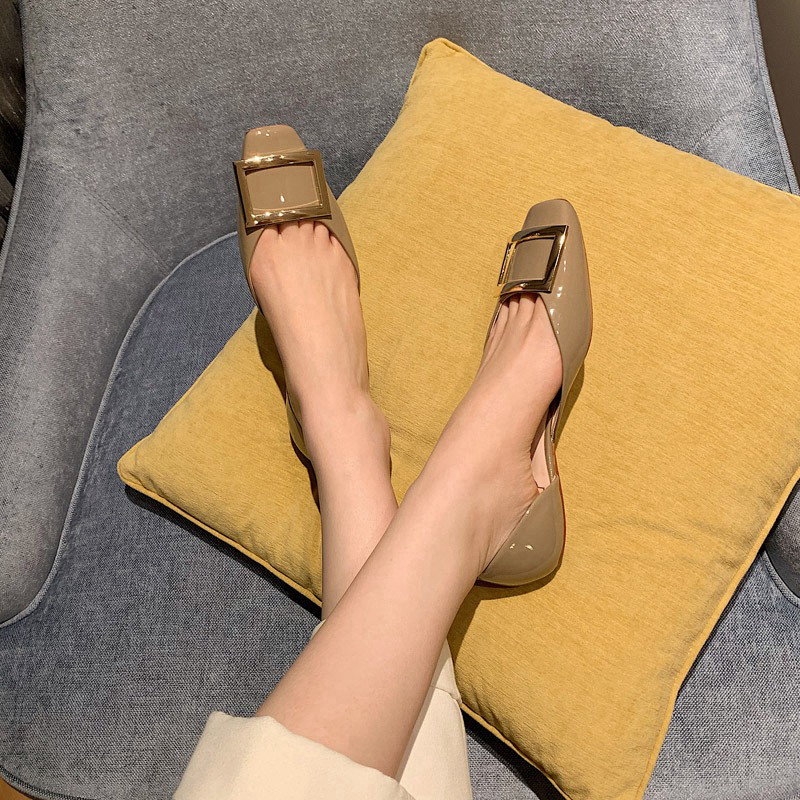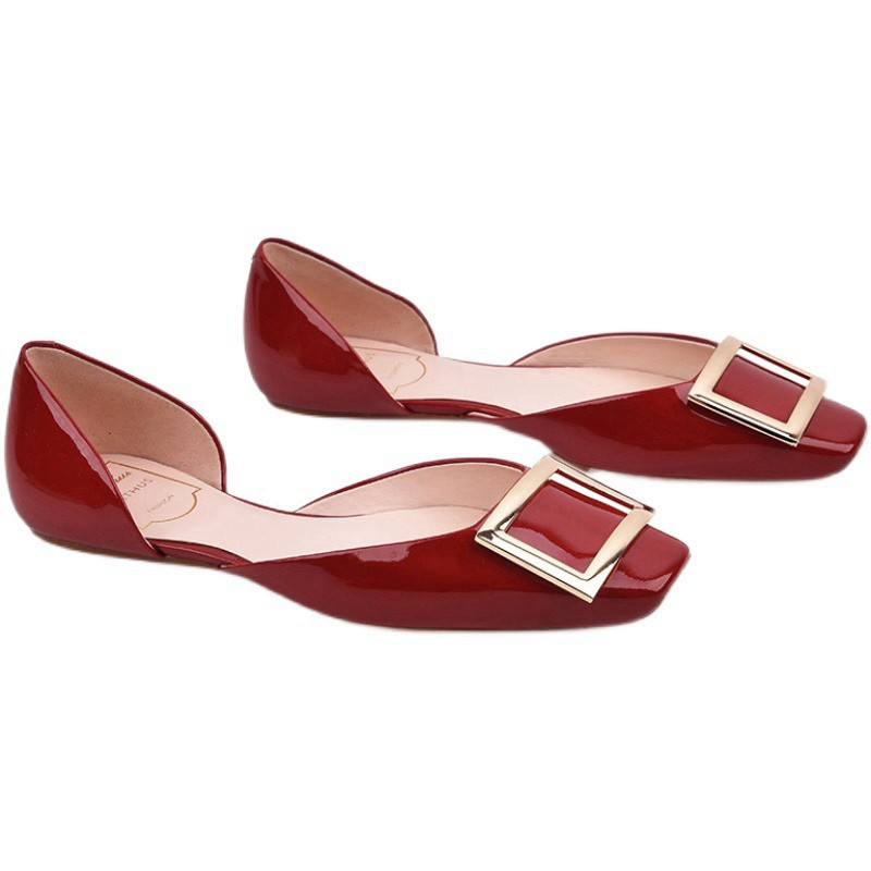 2025春秋新款单鞋同款简风方扣漆皮方头浅口中空平底单鞋女春夏季