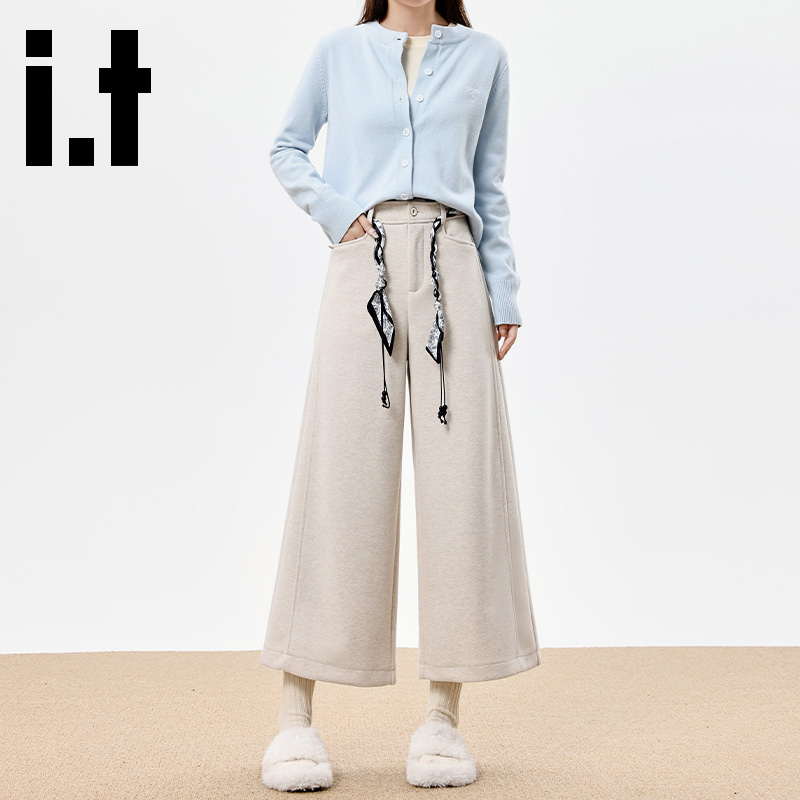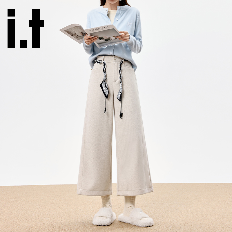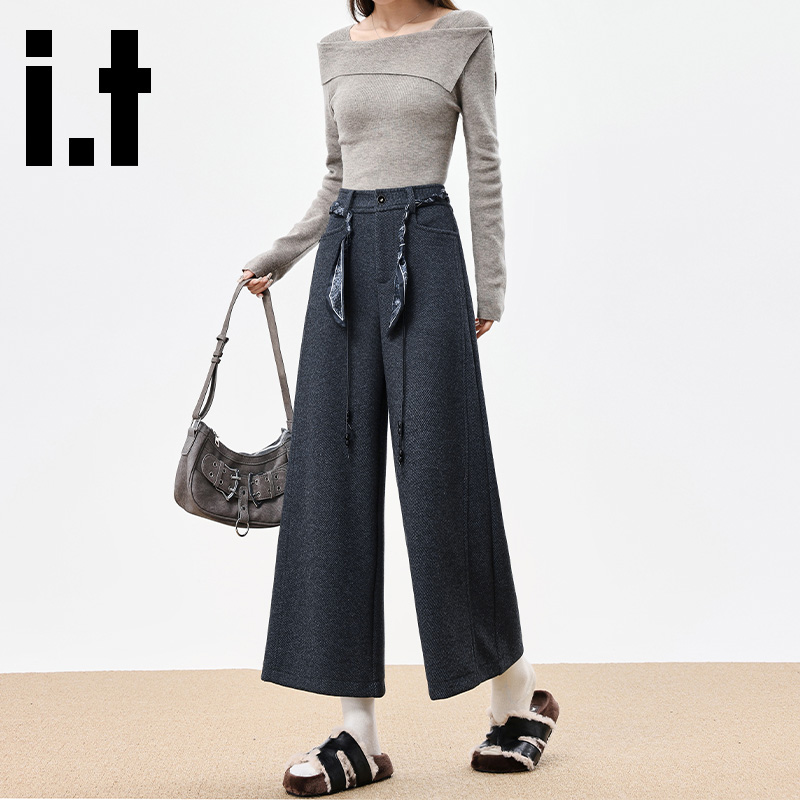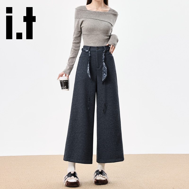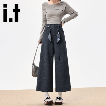 it:CHOCOOLATE高级丝巾系带毛呢西装裤女秋季高腰垂感九分阔腿裤